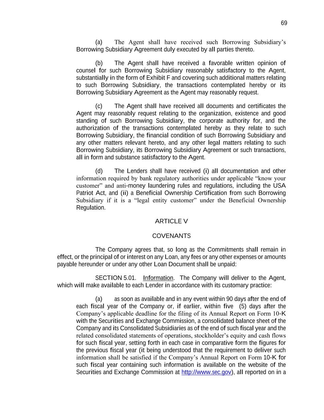 69 (a) The Agent shall have received such Borrowing Subsidiary’s Borrowing Subsidiary Agreement duly executed by all parties thereto. (b) The Agent shall have received a favorable written opinion of counsel for such Borrowing Subsidiary reasonably satisfactory to the Agent, substantially in the form of Exhibit F and covering such additional matters relating to such Borrowing Subsidiary, the transactions contemplated hereby or its Borrowing Subsidiary Agreement as the Agent may reasonably request. (c) The Agent shall have received all documents and certificates the Agent may reasonably request relating to the organization, existence and good standing of such Borrowing Subsidiary, the corporate authority for, and the authorization of the transactions contemplated hereby as they relate to such Borrowing Subsidiary, the financial condition of such Borrowing Subsidiary and any other matters relevant hereto, and any other legal matters relating to such Borrowing Subsidiary, its Borrowing Subsidiary Agreement or such transactions, all in form and substance satisfactory to the Agent. (d) The Lenders shall have received (i) all documentation and other information required by bank regulatory authorities under applicable “know your customer” and anti-money laundering rules and regulations, including the USA Patriot Act, and (ii) a Beneficial Ownership Certification from such Borrowing Subsidiary if it is a “legal entity customer” under the Beneficial Ownership Regulation. ARTICLE V COVENANTS The Company agrees that, so long as the Commitments shall remain in effect, or the principal of or interest on any Loan, any fees or any other expenses or amounts payable hereunder or under any other Loan Document shall be unpaid: SECTION 5.01. Information. The Company will deliver to the Agent, which will make available to each Lender in accordance with its customary practice: (a) as soon as available and in any event within 90 days after the end of each fiscal year of the Company or, if earlier, within five (5) days after the Company’s applicable deadline for the filing of its Annual Report on Form 10-K with the Securities and Exchange Commission, a consolidated balance sheet of the Company and its Consolidated Subsidiaries as of the end of such fiscal year and the related consolidated statements of operations, stockholder’s equity and cash flows for such fiscal year, setting forth in each case in comparative form the figures for the previous fiscal year (it being understood that the requirement to deliver such information shall be satisfied if the Company’s Annual Report on Form 10-K for such fiscal year containing such information is available on the website of the Securities and Exchange Commission at http://www.sec.gov), all reported on in a