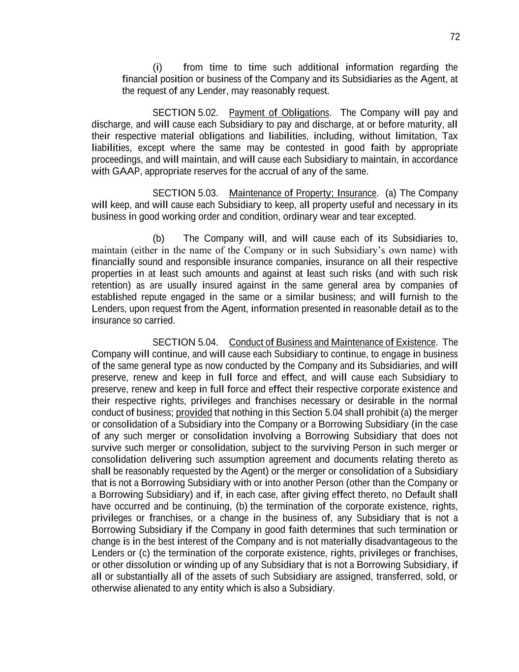 72 (i) from time to time such additional information regarding the financial position or business of the Company and its Subsidiaries as the Agent, at the request of any Lender, may reasonably request. SECTION 5.02. Payment of Obligations. The Company will pay and discharge, and will cause each Subsidiary to pay and discharge, at or before maturity, all their respective material obligations and liabilities, including, without limitation, Tax liabilities, except where the same may be contested in good faith by appropriate proceedings, and will maintain, and will cause each Subsidiary to maintain, in accordance with GAAP, appropriate reserves for the accrual of any of the same. SECTION 5.03. Maintenance of Property; Insurance. (a) The Company will keep, and will cause each Subsidiary to keep, all property useful and necessary in its business in good working order and condition, ordinary wear and tear excepted. (b) The Company will, and will cause each of its Subsidiaries to, maintain (either in the name of the Company or in such Subsidiary’s own name) with financially sound and responsible insurance companies, insurance on all their respective properties in at least such amounts and against at least such risks (and with such risk retention) as are usually insured against in the same general area by companies of established repute engaged in the same or a similar business; and will furnish to the Lenders, upon request from the Agent, information presented in reasonable detail as to the insurance so carried. SECTION 5.04. Conduct of Business and Maintenance of Existence. The Company will continue, and will cause each Subsidiary to continue, to engage in business of the same general type as now conducted by the Company and its Subsidiaries, and will preserve, renew and keep in full force and effect, and will cause each Subsidiary to preserve, renew and keep in full force and effect their respective corporate existence and their respective rights, privileges and franchises necessary or desirable in the normal conduct of business; provided that nothing in this Section 5.04 shall prohibit (a) the merger or consolidation of a Subsidiary into the Company or a Borrowing Subsidiary (in the case of any such merger or consolidation involving a Borrowing Subsidiary that does not survive such merger or consolidation, subject to the surviving Person in such merger or consolidation delivering such assumption agreement and documents relating thereto as shall be reasonably requested by the Agent) or the merger or consolidation of a Subsidiary that is not a Borrowing Subsidiary with or into another Person (other than the Company or a Borrowing Subsidiary) and if, in each case, after giving effect thereto, no Default shall have occurred and be continuing, (b) the termination of the corporate existence, rights, privileges or franchises, or a change in the business of, any Subsidiary that is not a Borrowing Subsidiary if the Company in good faith determines that such termination or change is in the best interest of the Company and is not materially disadvantageous to the Lenders or (c) the termination of the corporate existence, rights, privileges or franchises, or other dissolution or winding up of any Subsidiary that is not a Borrowing Subsidiary, if all or substantially all of the assets of such Subsidiary are assigned, transferred, sold, or otherwise alienated to any entity which is also a Subsidiary.