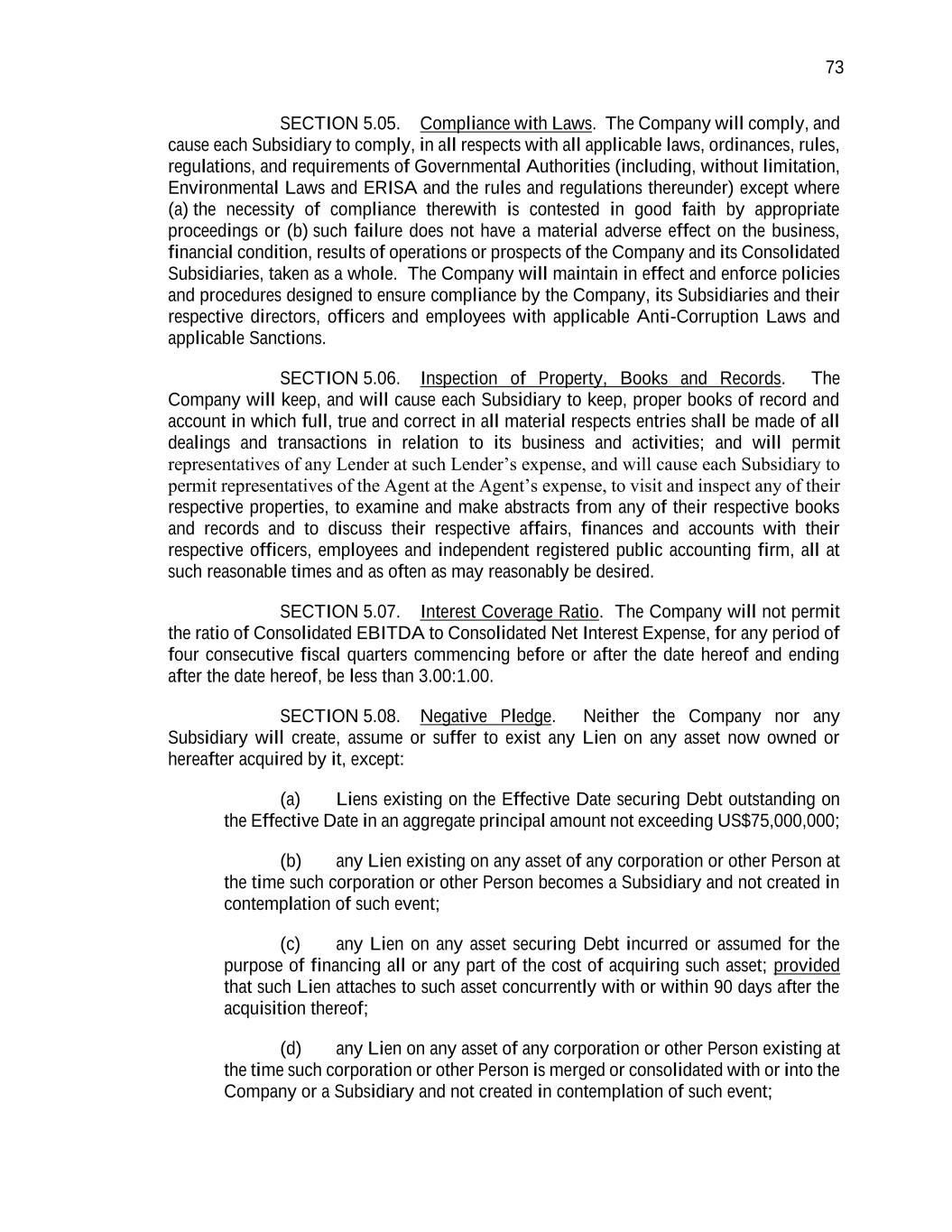 73 SECTION 5.05. Compliance with Laws. The Company will comply, and cause each Subsidiary to comply, in all respects with all applicable laws, ordinances, rules, regulations, and requirements of Governmental Authorities (including, without limitation, Environmental Laws and ERISA and the rules and regulations thereunder) except where (a) the necessity of compliance therewith is contested in good faith by appropriate proceedings or (b) such failure does not have a material adverse effect on the business, financial condition, results of operations or prospects of the Company and its Consolidated Subsidiaries, taken as a whole. The Company will maintain in effect and enforce policies and procedures designed to ensure compliance by the Company, its Subsidiaries and their respective directors, officers and employees with applicable Anti-Corruption Laws and applicable Sanctions. SECTION 5.06. Inspection of Property, Books and Records. The Company will keep, and will cause each Subsidiary to keep, proper books of record and account in which full, true and correct in all material respects entries shall be made of all dealings and transactions in relation to its business and activities; and will permit representatives of any Lender at such Lender’s expense, and will cause each Subsidiary to permit representatives of the Agent at the Agent’s expense, to visit and inspect any of their respective properties, to examine and make abstracts from any of their respective books and records and to discuss their respective affairs, finances and accounts with their respective officers, employees and independent registered public accounting firm, all at such reasonable times and as often as may reasonably be desired. SECTION 5.07. Interest Coverage Ratio. The Company will not permit the ratio of Consolidated EBITDA to Consolidated Net Interest Expense, for any period of four consecutive fiscal quarters commencing before or after the date hereof and ending after the date hereof, be less than 3.00:1.00. SECTION 5.08. Negative Pledge. Neither the Company nor any Subsidiary will create, assume or suffer to exist any Lien on any asset now owned or hereafter acquired by it, except: (a) Liens existing on the Effective Date securing Debt outstanding on the Effective Date in an aggregate principal amount not exceeding US$75,000,000; (b) any Lien existing on any asset of any corporation or other Person at the time such corporation or other Person becomes a Subsidiary and not created in contemplation of such event; (c) any Lien on any asset securing Debt incurred or assumed for the purpose of financing all or any part of the cost of acquiring such asset; provided that such Lien attaches to such asset concurrently with or within 90 days after the acquisition thereof; (d) any Lien on any asset of any corporation or other Person existing at the time such corporation or other Person is merged or consolidated with or into the Company or a Subsidiary and not created in contemplation of such event;