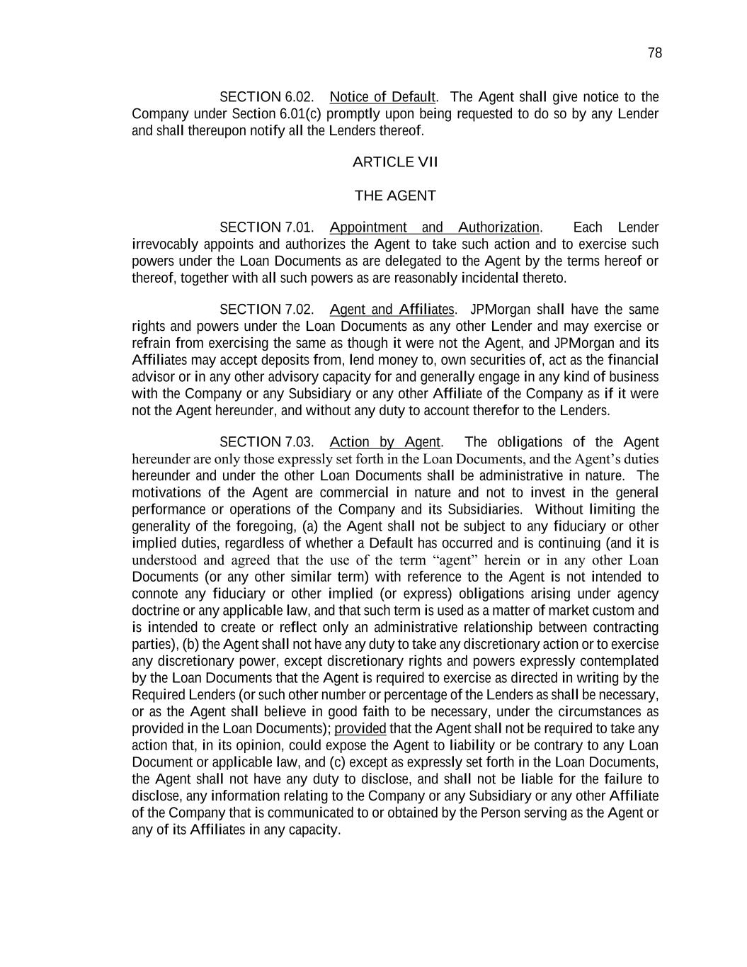 78 SECTION 6.02. Notice of Default. The Agent shall give notice to the Company under Section 6.01(c) promptly upon being requested to do so by any Lender and shall thereupon notify all the Lenders thereof. ARTICLE VII THE AGENT SECTION 7.01. Appointment and Authorization. Each Lender irrevocably appoints and authorizes the Agent to take such action and to exercise such powers under the Loan Documents as are delegated to the Agent by the terms hereof or thereof, together with all such powers as are reasonably incidental thereto. SECTION 7.02. Agent and Affiliates. JPMorgan shall have the same rights and powers under the Loan Documents as any other Lender and may exercise or refrain from exercising the same as though it were not the Agent, and JPMorgan and its Affiliates may accept deposits from, lend money to, own securities of, act as the financial advisor or in any other advisory capacity for and generally engage in any kind of business with the Company or any Subsidiary or any other Affiliate of the Company as if it were not the Agent hereunder, and without any duty to account therefor to the Lenders. SECTION 7.03. Action by Agent. The obligations of the Agent hereunder are only those expressly set forth in the Loan Documents, and the Agent’s duties hereunder and under the other Loan Documents shall be administrative in nature. The motivations of the Agent are commercial in nature and not to invest in the general performance or operations of the Company and its Subsidiaries. Without limiting the generality of the foregoing, (a) the Agent shall not be subject to any fiduciary or other implied duties, regardless of whether a Default has occurred and is continuing (and it is understood and agreed that the use of the term “agent” herein or in any other Loan Documents (or any other similar term) with reference to the Agent is not intended to connote any fiduciary or other implied (or express) obligations arising under agency doctrine or any applicable law, and that such term is used as a matter of market custom and is intended to create or reflect only an administrative relationship between contracting parties), (b) the Agent shall not have any duty to take any discretionary action or to exercise any discretionary power, except discretionary rights and powers expressly contemplated by the Loan Documents that the Agent is required to exercise as directed in writing by the Required Lenders (or such other number or percentage of the Lenders as shall be necessary, or as the Agent shall believe in good faith to be necessary, under the circumstances as provided in the Loan Documents); provided that the Agent shall not be required to take any action that, in its opinion, could expose the Agent to liability or be contrary to any Loan Document or applicable law, and (c) except as expressly set forth in the Loan Documents, the Agent shall not have any duty to disclose, and shall not be liable for the failure to disclose, any information relating to the Company or any Subsidiary or any other Affiliate of the Company that is communicated to or obtained by the Person serving as the Agent or any of its Affiliates in any capacity.