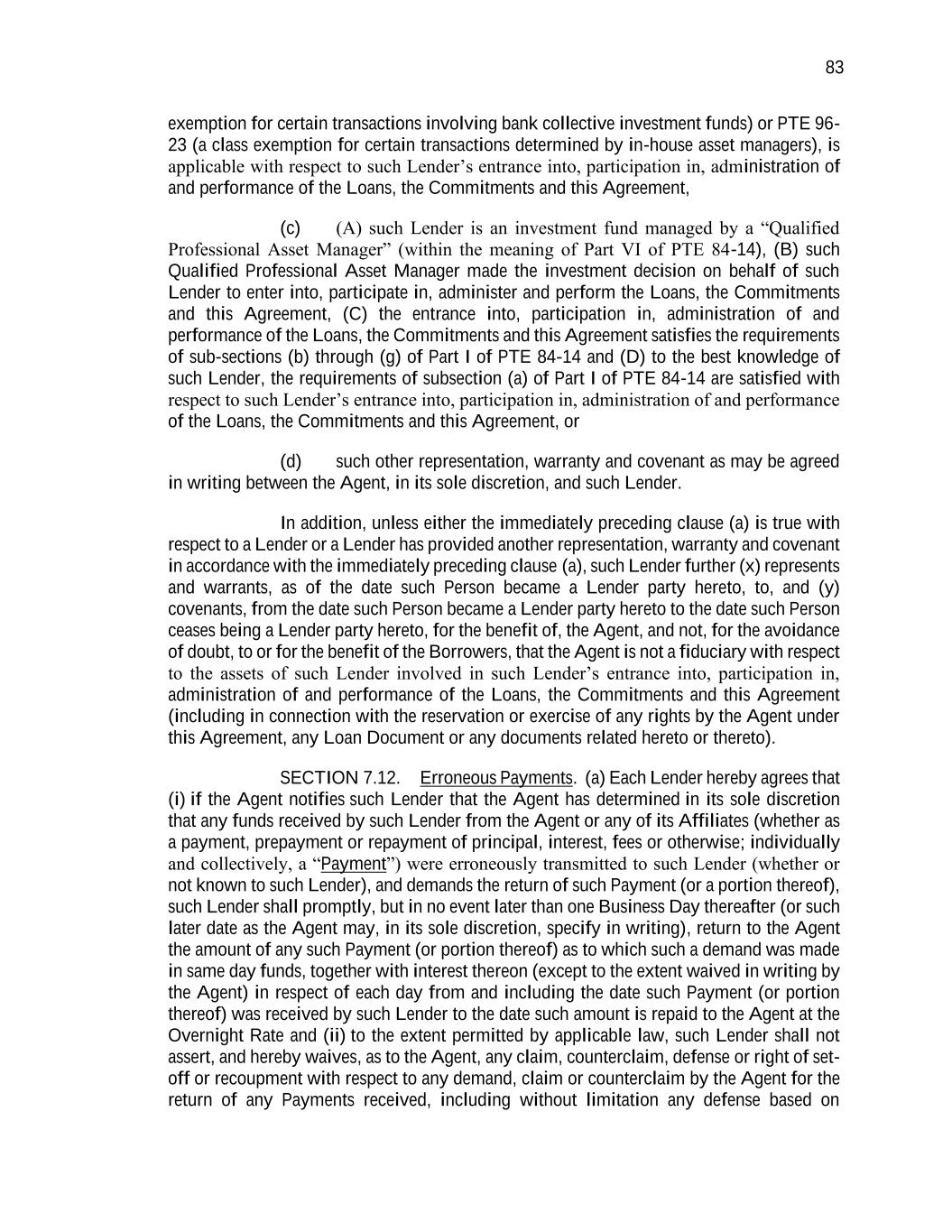 83 exemption for certain transactions involving bank collective investment funds) or PTE 96- 23 (a class exemption for certain transactions determined by in-house asset managers), is applicable with respect to such Lender’s entrance into, participation in, administration of and performance of the Loans, the Commitments and this Agreement, (c) (A) such Lender is an investment fund managed by a “Qualified Professional Asset Manager” (within the meaning of Part VI of PTE 84-14), (B) such Qualified Professional Asset Manager made the investment decision on behalf of such Lender to enter into, participate in, administer and perform the Loans, the Commitments and this Agreement, (C) the entrance into, participation in, administration of and performance of the Loans, the Commitments and this Agreement satisfies the requirements of sub-sections (b) through (g) of Part I of PTE 84-14 and (D) to the best knowledge of such Lender, the requirements of subsection (a) of Part I of PTE 84-14 are satisfied with respect to such Lender’s entrance into, participation in, administration of and performance of the Loans, the Commitments and this Agreement, or (d) such other representation, warranty and covenant as may be agreed in writing between the Agent, in its sole discretion, and such Lender. In addition, unless either the immediately preceding clause (a) is true with respect to a Lender or a Lender has provided another representation, warranty and covenant in accordance with the immediately preceding clause (a), such Lender further (x) represents and warrants, as of the date such Person became a Lender party hereto, to, and (y) covenants, from the date such Person became a Lender party hereto to the date such Person ceases being a Lender party hereto, for the benefit of, the Agent, and not, for the avoidance of doubt, to or for the benefit of the Borrowers, that the Agent is not a fiduciary with respect to the assets of such Lender involved in such Lender’s entrance into, participation in, administration of and performance of the Loans, the Commitments and this Agreement (including in connection with the reservation or exercise of any rights by the Agent under this Agreement, any Loan Document or any documents related hereto or thereto). SECTION 7.12. Erroneous Payments. (a) Each Lender hereby agrees that (i) if the Agent notifies such Lender that the Agent has determined in its sole discretion that any funds received by such Lender from the Agent or any of its Affiliates (whether as a payment, prepayment or repayment of principal, interest, fees or otherwise; individually and collectively, a “Payment”) were erroneously transmitted to such Lender (whether or not known to such Lender), and demands the return of such Payment (or a portion thereof), such Lender shall promptly, but in no event later than one Business Day thereafter (or such later date as the Agent may, in its sole discretion, specify in writing), return to the Agent the amount of any such Payment (or portion thereof) as to which such a demand was made in same day funds, together with interest thereon (except to the extent waived in writing by the Agent) in respect of each day from and including the date such Payment (or portion thereof) was received by such Lender to the date such amount is repaid to the Agent at the Overnight Rate and (ii) to the extent permitted by applicable law, such Lender shall not assert, and hereby waives, as to the Agent, any claim, counterclaim, defense or right of set- off or recoupment with respect to any demand, claim or counterclaim by the Agent for the return of any Payments received, including without limitation any defense based on