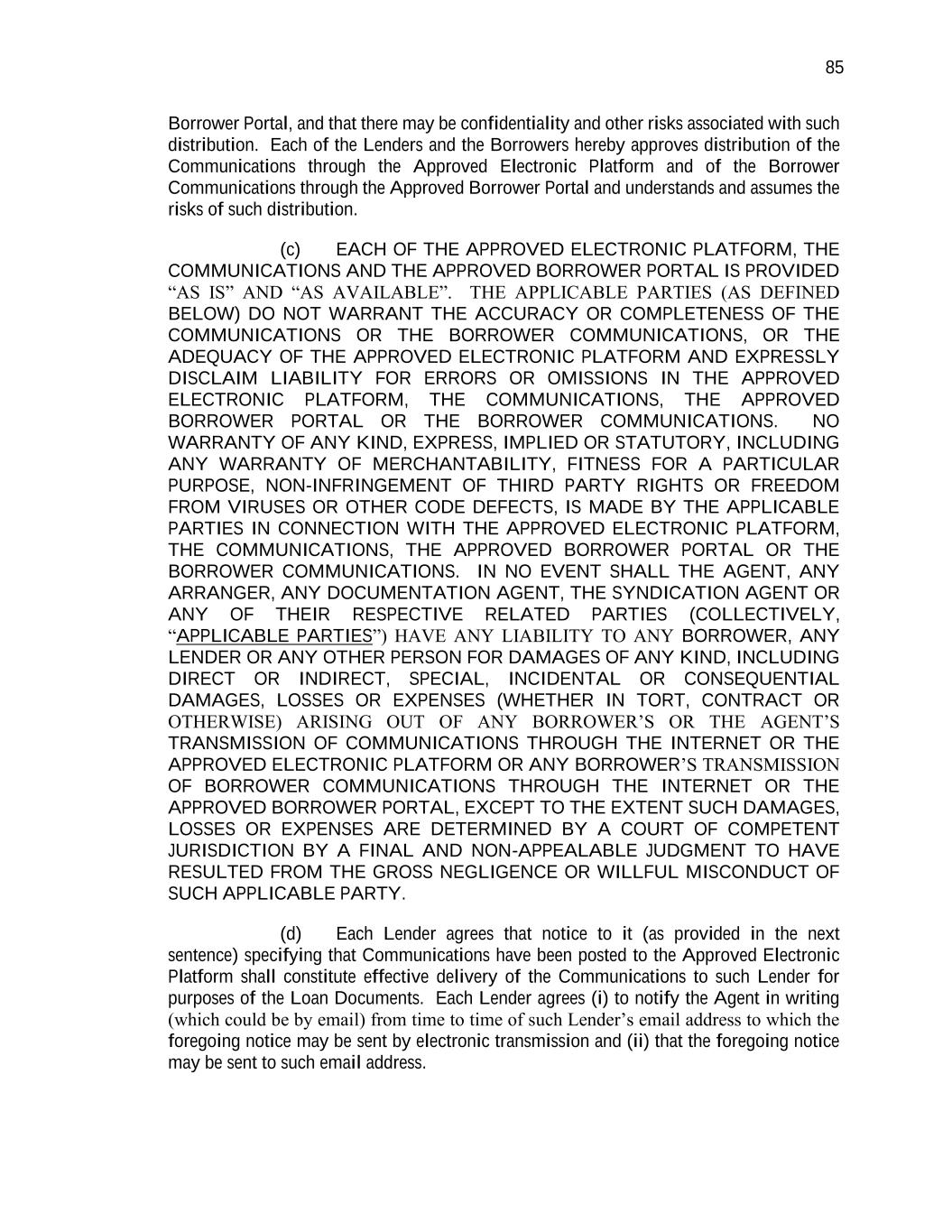 85 Borrower Portal, and that there may be confidentiality and other risks associated with such distribution. Each of the Lenders and the Borrowers hereby approves distribution of the Communications through the Approved Electronic Platform and of the Borrower Communications through the Approved Borrower Portal and understands and assumes the risks of such distribution. (c) EACH OF THE APPROVED ELECTRONIC PLATFORM, THE COMMUNICATIONS AND THE APPROVED BORROWER PORTAL IS PROVIDED “AS IS” AND “AS AVAILABLE”. THE APPLICABLE PARTIES (AS DEFINED BELOW) DO NOT WARRANT THE ACCURACY OR COMPLETENESS OF THE COMMUNICATIONS OR THE BORROWER COMMUNICATIONS, OR THE ADEQUACY OF THE APPROVED ELECTRONIC PLATFORM AND EXPRESSLY DISCLAIM LIABILITY FOR ERRORS OR OMISSIONS IN THE APPROVED ELECTRONIC PLATFORM, THE COMMUNICATIONS, THE APPROVED BORROWER PORTAL OR THE BORROWER COMMUNICATIONS. NO WARRANTY OF ANY KIND, EXPRESS, IMPLIED OR STATUTORY, INCLUDING ANY WARRANTY OF MERCHANTABILITY, FITNESS FOR A PARTICULAR PURPOSE, NON-INFRINGEMENT OF THIRD PARTY RIGHTS OR FREEDOM FROM VIRUSES OR OTHER CODE DEFECTS, IS MADE BY THE APPLICABLE PARTIES IN CONNECTION WITH THE APPROVED ELECTRONIC PLATFORM, THE COMMUNICATIONS, THE APPROVED BORROWER PORTAL OR THE BORROWER COMMUNICATIONS. IN NO EVENT SHALL THE AGENT, ANY ARRANGER, ANY DOCUMENTATION AGENT, THE SYNDICATION AGENT OR ANY OF THEIR RESPECTIVE RELATED PARTIES (COLLECTIVELY, “APPLICABLE PARTIES”) HAVE ANY LIABILITY TO ANY BORROWER, ANY LENDER OR ANY OTHER PERSON FOR DAMAGES OF ANY KIND, INCLUDING DIRECT OR INDIRECT, SPECIAL, INCIDENTAL OR CONSEQUENTIAL DAMAGES, LOSSES OR EXPENSES (WHETHER IN TORT, CONTRACT OR OTHERWISE) ARISING OUT OF ANY BORROWER’S OR THE AGENT’S TRANSMISSION OF COMMUNICATIONS THROUGH THE INTERNET OR THE APPROVED ELECTRONIC PLATFORM OR ANY BORROWER’S TRANSMISSION OF BORROWER COMMUNICATIONS THROUGH THE INTERNET OR THE APPROVED BORROWER PORTAL, EXCEPT TO THE EXTENT SUCH DAMAGES, LOSSES OR EXPENSES ARE DETERMINED BY A COURT OF COMPETENT JURISDICTION BY A FINAL AND NON-APPEALABLE JUDGMENT TO HAVE RESULTED FROM THE GROSS NEGLIGENCE OR WILLFUL MISCONDUCT OF SUCH APPLICABLE PARTY. (d) Each Lender agrees that notice to it (as provided in the next sentence) specifying that Communications have been posted to the Approved Electronic Platform shall constitute effective delivery of the Communications to such Lender for purposes of the Loan Documents. Each Lender agrees (i) to notify the Agent in writing (which could be by email) from time to time of such Lender’s email address to which the foregoing notice may be sent by electronic transmission and (ii) that the foregoing notice may be sent to such email address.