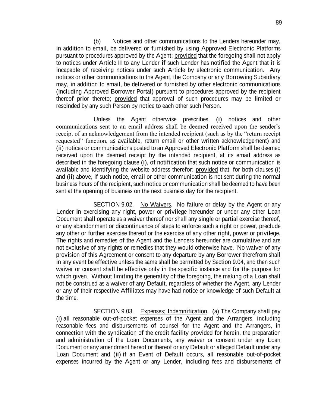 89 (b) Notices and other communications to the Lenders hereunder may, in addition to email, be delivered or furnished by using Approved Electronic Platforms pursuant to procedures approved by the Agent; provided that the foregoing shall not apply to notices under Article II to any Lender if such Lender has notified the Agent that it is incapable of receiving notices under such Article by electronic communication. Any notices or other communications to the Agent, the Company or any Borrowing Subsidiary may, in addition to email, be delivered or furnished by other electronic communications (including Approved Borrower Portal) pursuant to procedures approved by the recipient thereof prior thereto; provided that approval of such procedures may be limited or rescinded by any such Person by notice to each other such Person. Unless the Agent otherwise prescribes, (i) notices and other communications sent to an email address shall be deemed received upon the sender’s receipt of an acknowledgement from the intended recipient (such as by the “return receipt requested” function, as available, return email or other written acknowledgement) and (ii) notices or communications posted to an Approved Electronic Platform shall be deemed received upon the deemed receipt by the intended recipient, at its email address as described in the foregoing clause (i), of notification that such notice or communication is available and identifying the website address therefor; provided that, for both clauses (i) and (ii) above, if such notice, email or other communication is not sent during the normal business hours of the recipient, such notice or communication shall be deemed to have been sent at the opening of business on the next business day for the recipient. SECTION 9.02. No Waivers. No failure or delay by the Agent or any Lender in exercising any right, power or privilege hereunder or under any other Loan Document shall operate as a waiver thereof nor shall any single or partial exercise thereof, or any abandonment or discontinuance of steps to enforce such a right or power, preclude any other or further exercise thereof or the exercise of any other right, power or privilege. The rights and remedies of the Agent and the Lenders hereunder are cumulative and are not exclusive of any rights or remedies that they would otherwise have. No waiver of any provision of this Agreement or consent to any departure by any Borrower therefrom shall in any event be effective unless the same shall be permitted by Section 9.04, and then such waiver or consent shall be effective only in the specific instance and for the purpose for which given. Without limiting the generality of the foregoing, the making of a Loan shall not be construed as a waiver of any Default, regardless of whether the Agent, any Lender or any of their respective Affiliates may have had notice or knowledge of such Default at the time. SECTION 9.03. Expenses; Indemnification. (a) The Company shall pay (i) all reasonable out-of-pocket expenses of the Agent and the Arrangers, including reasonable fees and disbursements of counsel for the Agent and the Arrangers, in connection with the syndication of the credit facility provided for herein, the preparation and administration of the Loan Documents, any waiver or consent under any Loan Document or any amendment hereof or thereof or any Default or alleged Default under any Loan Document and (ii) if an Event of Default occurs, all reasonable out-of-pocket expenses incurred by the Agent or any Lender, including fees and disbursements of