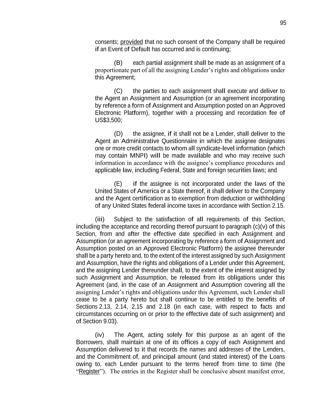 95 consents; provided that no such consent of the Company shall be required if an Event of Default has occurred and is continuing; (B) each partial assignment shall be made as an assignment of a proportionate part of all the assigning Lender’s rights and obligations under this Agreement; (C) the parties to each assignment shall execute and deliver to the Agent an Assignment and Assumption (or an agreement incorporating by reference a form of Assignment and Assumption posted on an Approved Electronic Platform), together with a processing and recordation fee of US$3,500; (D) the assignee, if it shall not be a Lender, shall deliver to the Agent an Administrative Questionnaire in which the assignee designates one or more credit contacts to whom all syndicate-level information (which may contain MNPI) will be made available and who may receive such information in accordance with the assignee’s compliance procedures and applicable law, including Federal, State and foreign securities laws; and (E) if the assignee is not incorporated under the laws of the United States of America or a State thereof, it shall deliver to the Company and the Agent certification as to exemption from deduction or withholding of any United States federal income taxes in accordance with Section 2.15. (iii) Subject to the satisfaction of all requirements of this Section, including the acceptance and recording thereof pursuant to paragraph (c)(v) of this Section, from and after the effective date specified in each Assignment and Assumption (or an agreement incorporating by reference a form of Assignment and Assumption posted on an Approved Electronic Platform) the assignee thereunder shall be a party hereto and, to the extent of the interest assigned by such Assignment and Assumption, have the rights and obligations of a Lender under this Agreement, and the assigning Lender thereunder shall, to the extent of the interest assigned by such Assignment and Assumption, be released from its obligations under this Agreement (and, in the case of an Assignment and Assumption covering all the assigning Lender’s rights and obligations under this Agreement, such Lender shall cease to be a party hereto but shall continue to be entitled to the benefits of Sections 2.13, 2.14, 2.15 and 2.18 (in each case, with respect to facts and circumstances occurring on or prior to the effective date of such assignment) and of Section 9.03). (iv) The Agent, acting solely for this purpose as an agent of the Borrowers, shall maintain at one of its offices a copy of each Assignment and Assumption delivered to it that records the names and addresses of the Lenders, and the Commitment of, and principal amount (and stated interest) of the Loans owing to, each Lender pursuant to the terms hereof from time to time (the “Register”). The entries in the Register shall be conclusive absent manifest error,