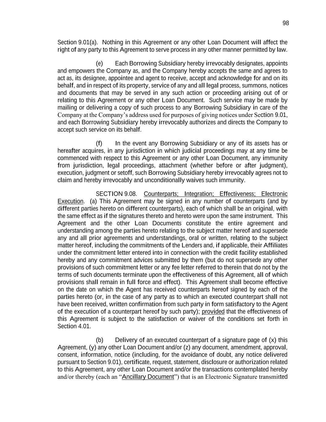 98 Section 9.01(a). Nothing in this Agreement or any other Loan Document will affect the right of any party to this Agreement to serve process in any other manner permitted by law. (e) Each Borrowing Subsidiary hereby irrevocably designates, appoints and empowers the Company as, and the Company hereby accepts the same and agrees to act as, its designee, appointee and agent to receive, accept and acknowledge for and on its behalf, and in respect of its property, service of any and all legal process, summons, notices and documents that may be served in any such action or proceeding arising out of or relating to this Agreement or any other Loan Document. Such service may be made by mailing or delivering a copy of such process to any Borrowing Subsidiary in care of the Company at the Company’s address used for purposes of giving notices under Section 9.01, and each Borrowing Subsidiary hereby irrevocably authorizes and directs the Company to accept such service on its behalf. (f) In the event any Borrowing Subsidiary or any of its assets has or hereafter acquires, in any jurisdiction in which judicial proceedings may at any time be commenced with respect to this Agreement or any other Loan Document, any immunity from jurisdiction, legal proceedings, attachment (whether before or after judgment), execution, judgment or setoff, such Borrowing Subsidiary hereby irrevocably agrees not to claim and hereby irrevocably and unconditionally waives such immunity. SECTION 9.08. Counterparts; Integration; Effectiveness; Electronic Execution. (a) This Agreement may be signed in any number of counterparts (and by different parties hereto on different counterparts), each of which shall be an original, with the same effect as if the signatures thereto and hereto were upon the same instrument. This Agreement and the other Loan Documents constitute the entire agreement and understanding among the parties hereto relating to the subject matter hereof and supersede any and all prior agreements and understandings, oral or written, relating to the subject matter hereof, including the commitments of the Lenders and, if applicable, their Affiliates under the commitment letter entered into in connection with the credit facility established hereby and any commitment advices submitted by them (but do not supersede any other provisions of such commitment letter or any fee letter referred to therein that do not by the terms of such documents terminate upon the effectiveness of this Agreement, all of which provisions shall remain in full force and effect). This Agreement shall become effective on the date on which the Agent has received counterparts hereof signed by each of the parties hereto (or, in the case of any party as to which an executed counterpart shall not have been received, written confirmation from such party in form satisfactory to the Agent of the execution of a counterpart hereof by such party); provided that the effectiveness of this Agreement is subject to the satisfaction or waiver of the conditions set forth in Section 4.01. (b) Delivery of an executed counterpart of a signature page of (x) this Agreement, (y) any other Loan Document and/or (z) any document, amendment, approval, consent, information, notice (including, for the avoidance of doubt, any notice delivered pursuant to Section 9.01), certificate, request, statement, disclosure or authorization related to this Agreement, any other Loan Document and/or the transactions contemplated hereby and/or thereby (each an “Ancillary Document”) that is an Electronic Signature transmitted