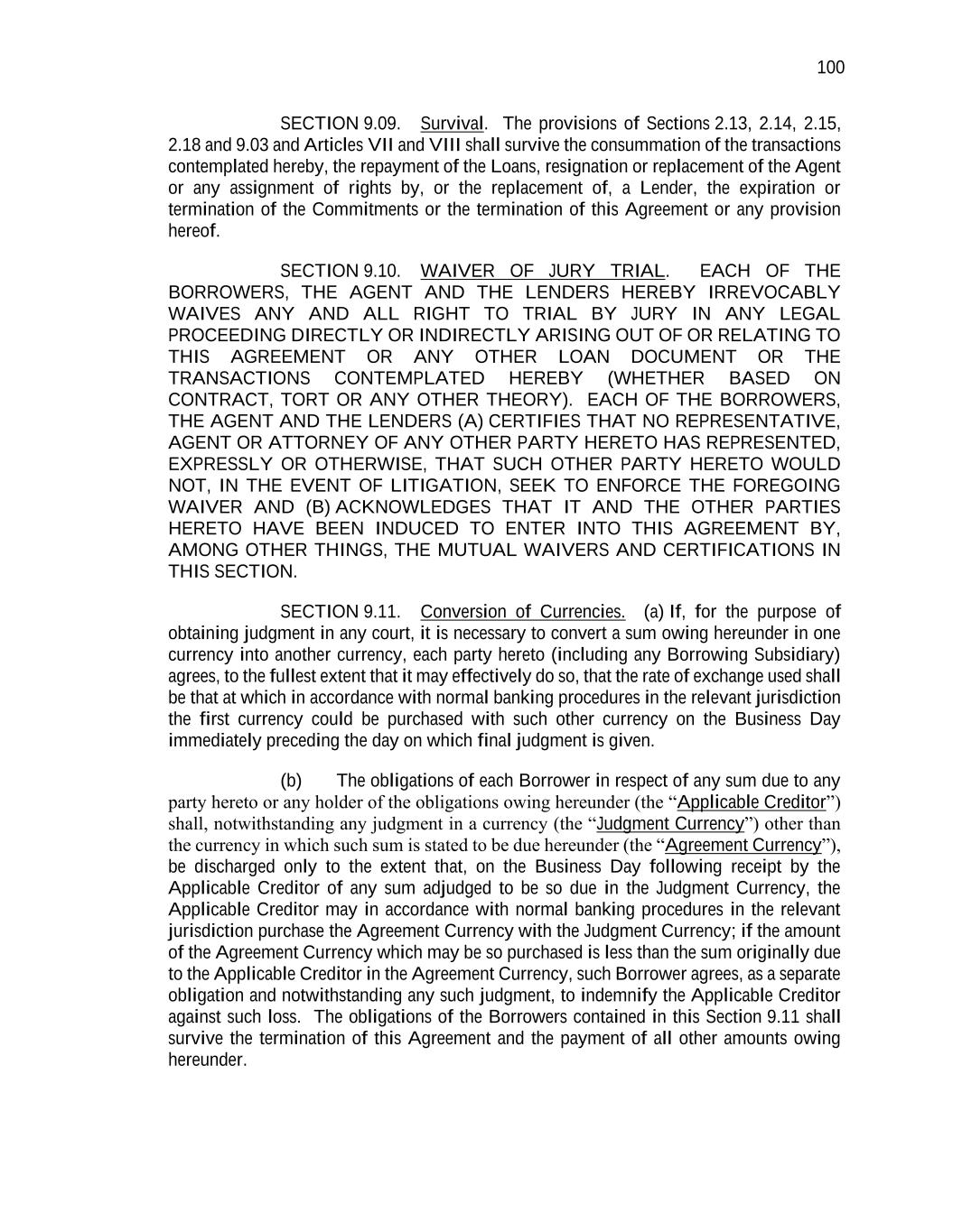 100 SECTION 9.09. Survival. The provisions of Sections 2.13, 2.14, 2.15, 2.18 and 9.03 and Articles VII and VIII shall survive the consummation of the transactions contemplated hereby, the repayment of the Loans, resignation or replacement of the Agent or any assignment of rights by, or the replacement of, a Lender, the expiration or termination of the Commitments or the termination of this Agreement or any provision hereof. SECTION 9.10. WAIVER OF JURY TRIAL. EACH OF THE BORROWERS, THE AGENT AND THE LENDERS HEREBY IRREVOCABLY WAIVES ANY AND ALL RIGHT TO TRIAL BY JURY IN ANY LEGAL PROCEEDING DIRECTLY OR INDIRECTLY ARISING OUT OF OR RELATING TO THIS AGREEMENT OR ANY OTHER LOAN DOCUMENT OR THE TRANSACTIONS CONTEMPLATED HEREBY (WHETHER BASED ON CONTRACT, TORT OR ANY OTHER THEORY). EACH OF THE BORROWERS, THE AGENT AND THE LENDERS (A) CERTIFIES THAT NO REPRESENTATIVE, AGENT OR ATTORNEY OF ANY OTHER PARTY HERETO HAS REPRESENTED, EXPRESSLY OR OTHERWISE, THAT SUCH OTHER PARTY HERETO WOULD NOT, IN THE EVENT OF LITIGATION, SEEK TO ENFORCE THE FOREGOING WAIVER AND (B) ACKNOWLEDGES THAT IT AND THE OTHER PARTIES HERETO HAVE BEEN INDUCED TO ENTER INTO THIS AGREEMENT BY, AMONG OTHER THINGS, THE MUTUAL WAIVERS AND CERTIFICATIONS IN THIS SECTION. SECTION 9.11. Conversion of Currencies. (a) If, for the purpose of obtaining judgment in any court, it is necessary to convert a sum owing hereunder in one currency into another currency, each party hereto (including any Borrowing Subsidiary) agrees, to the fullest extent that it may effectively do so, that the rate of exchange used shall be that at which in accordance with normal banking procedures in the relevant jurisdiction the first currency could be purchased with such other currency on the Business Day immediately preceding the day on which final judgment is given. (b) The obligations of each Borrower in respect of any sum due to any party hereto or any holder of the obligations owing hereunder (the “Applicable Creditor”) shall, notwithstanding any judgment in a currency (the “Judgment Currency”) other than the currency in which such sum is stated to be due hereunder (the “Agreement Currency”), be discharged only to the extent that, on the Business Day following receipt by the Applicable Creditor of any sum adjudged to be so due in the Judgment Currency, the Applicable Creditor may in accordance with normal banking procedures in the relevant jurisdiction purchase the Agreement Currency with the Judgment Currency; if the amount of the Agreement Currency which may be so purchased is less than the sum originally due to the Applicable Creditor in the Agreement Currency, such Borrower agrees, as a separate obligation and notwithstanding any such judgment, to indemnify the Applicable Creditor against such loss. The obligations of the Borrowers contained in this Section 9.11 shall survive the termination of this Agreement and the payment of all other amounts owing hereunder.