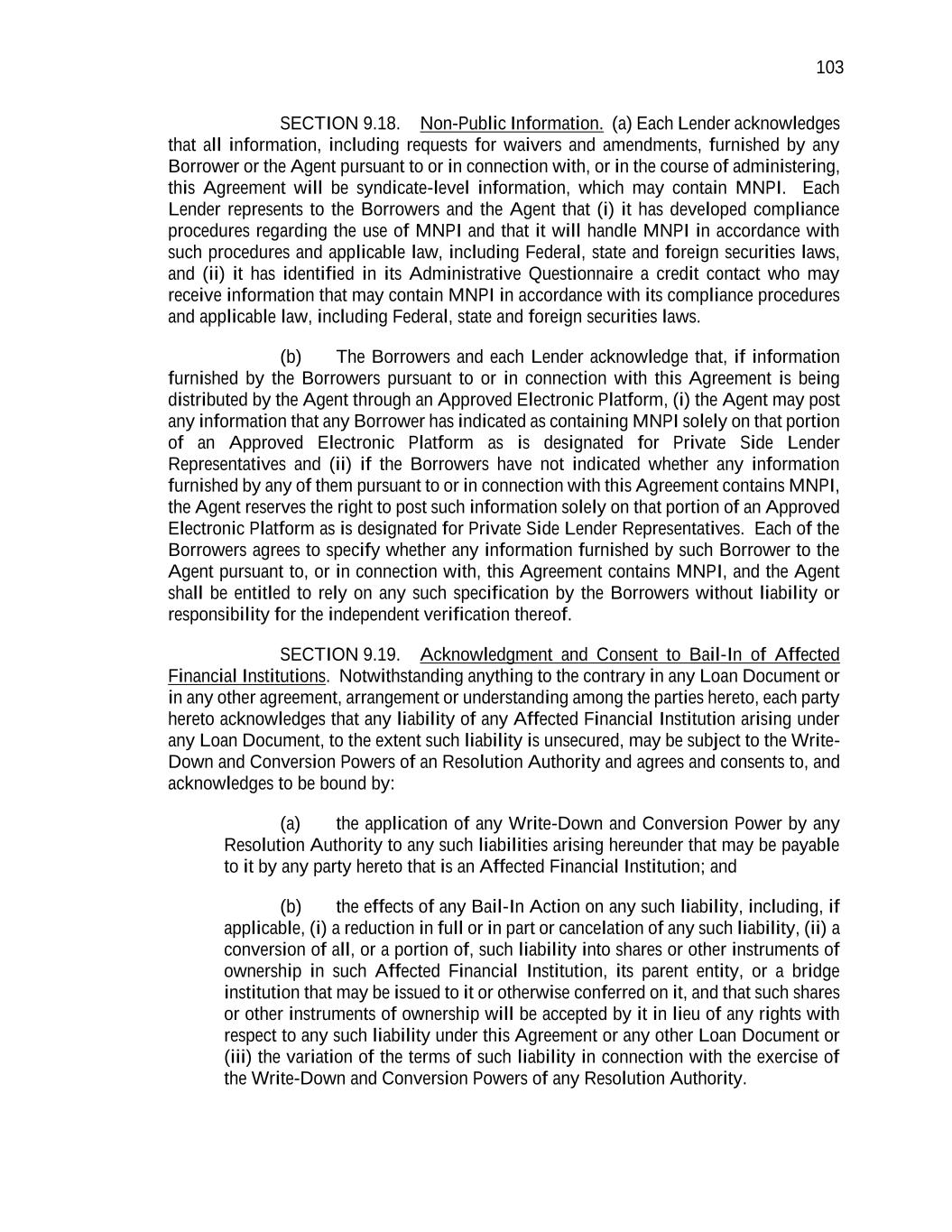 103 SECTION 9.18. Non-Public Information. (a) Each Lender acknowledges that all information, including requests for waivers and amendments, furnished by any Borrower or the Agent pursuant to or in connection with, or in the course of administering, this Agreement will be syndicate-level information, which may contain MNPI. Each Lender represents to the Borrowers and the Agent that (i) it has developed compliance procedures regarding the use of MNPI and that it will handle MNPI in accordance with such procedures and applicable law, including Federal, state and foreign securities laws, and (ii) it has identified in its Administrative Questionnaire a credit contact who may receive information that may contain MNPI in accordance with its compliance procedures and applicable law, including Federal, state and foreign securities laws. (b) The Borrowers and each Lender acknowledge that, if information furnished by the Borrowers pursuant to or in connection with this Agreement is being distributed by the Agent through an Approved Electronic Platform, (i) the Agent may post any information that any Borrower has indicated as containing MNPI solely on that portion of an Approved Electronic Platform as is designated for Private Side Lender Representatives and (ii) if the Borrowers have not indicated whether any information furnished by any of them pursuant to or in connection with this Agreement contains MNPI, the Agent reserves the right to post such information solely on that portion of an Approved Electronic Platform as is designated for Private Side Lender Representatives. Each of the Borrowers agrees to specify whether any information furnished by such Borrower to the Agent pursuant to, or in connection with, this Agreement contains MNPI, and the Agent shall be entitled to rely on any such specification by the Borrowers without liability or responsibility for the independent verification thereof. SECTION 9.19. Acknowledgment and Consent to Bail-In of Affected Financial Institutions. Notwithstanding anything to the contrary in any Loan Document or in any other agreement, arrangement or understanding among the parties hereto, each party hereto acknowledges that any liability of any Affected Financial Institution arising under any Loan Document, to the extent such liability is unsecured, may be subject to the Write- Down and Conversion Powers of an Resolution Authority and agrees and consents to, and acknowledges to be bound by: (a) the application of any Write-Down and Conversion Power by any Resolution Authority to any such liabilities arising hereunder that may be payable to it by any party hereto that is an Affected Financial Institution; and (b) the effects of any Bail-In Action on any such liability, including, if applicable, (i) a reduction in full or in part or cancelation of any such liability, (ii) a conversion of all, or a portion of, such liability into shares or other instruments of ownership in such Affected Financial Institution, its parent entity, or a bridge institution that may be issued to it or otherwise conferred on it, and that such shares or other instruments of ownership will be accepted by it in lieu of any rights with respect to any such liability under this Agreement or any other Loan Document or (iii) the variation of the terms of such liability in connection with the exercise of the Write-Down and Conversion Powers of any Resolution Authority.