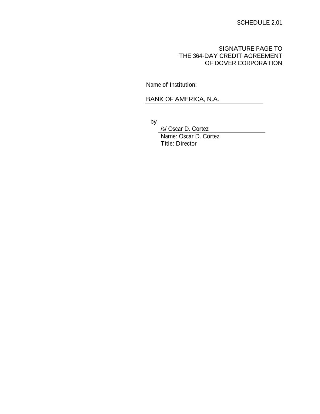 SCHEDULE 2.01 SIGNATURE PAGE TO THE 364-DAY CREDIT AGREEMENT OF DOVER CORPORATION Name of Institution: BANK OF AMERICA, N.A. by /s/ Oscar D. Cortez Name: Oscar D. Cortez Title: Director