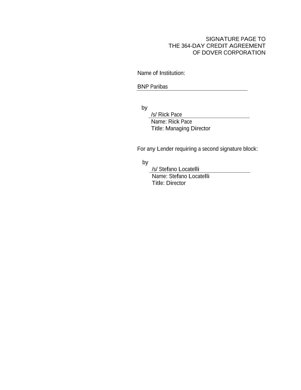 SIGNATURE PAGE TO THE 364-DAY CREDIT AGREEMENT OF DOVER CORPORATION Name of Institution: BNP Paribas by /s/ Rick Pace Name: Rick Pace Title: Managing Director For any Lender requiring a second signature block: by /s/ Stefano Locatelli Name: Stefano Locatelli Title: Director