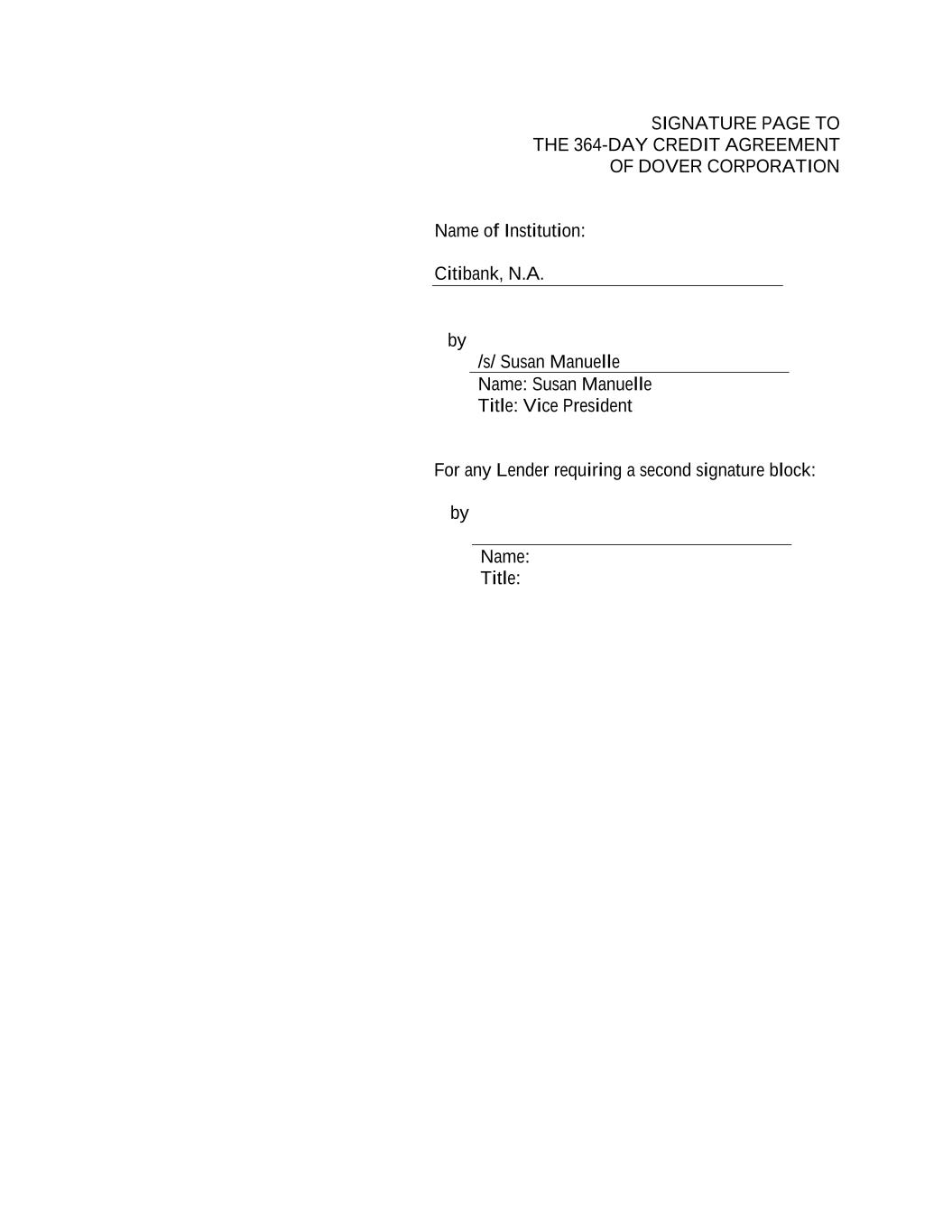 SIGNATURE PAGE TO THE 364-DAY CREDIT AGREEMENT OF DOVER CORPORATION Name of Institution: Citibank, N.A. by /s/ Susan Manuelle Name: Susan Manuelle Title: Vice President For any Lender requiring a second signature block: by Name: Title: