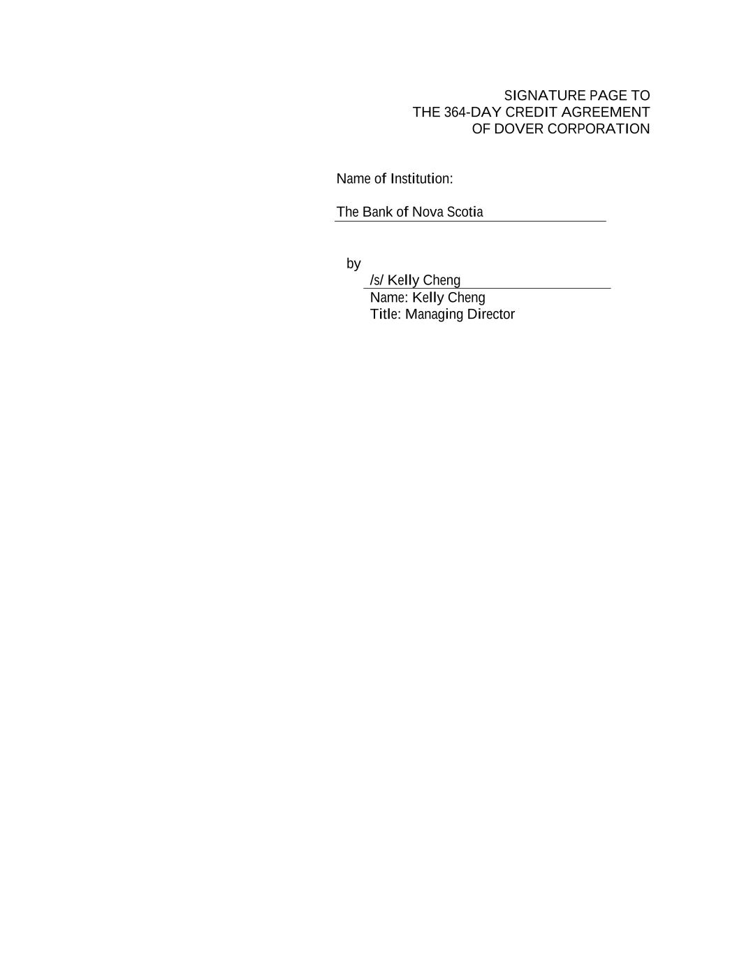 SIGNATURE PAGE TO THE 364-DAY CREDIT AGREEMENT OF DOVER CORPORATION Name of Institution: The Bank of Nova Scotia by /s/ Kelly Cheng Name: Kelly Cheng Title: Managing Director