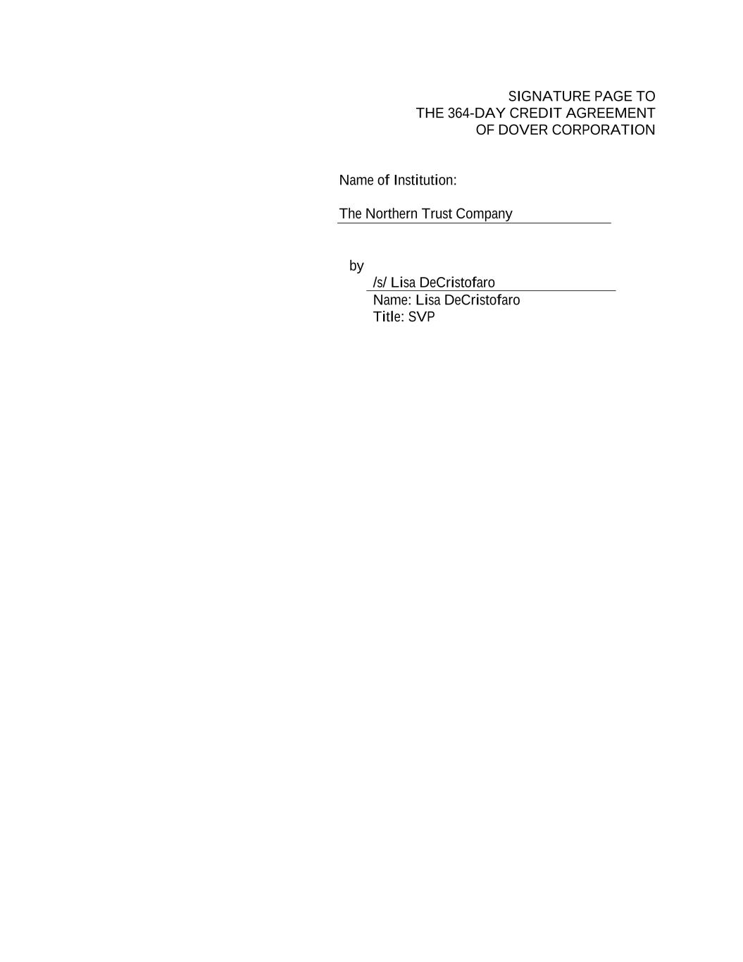SIGNATURE PAGE TO THE 364-DAY CREDIT AGREEMENT OF DOVER CORPORATION Name of Institution: The Northern Trust Company by /s/ Lisa DeCristofaro Name: Lisa DeCristofaro Title: SVP