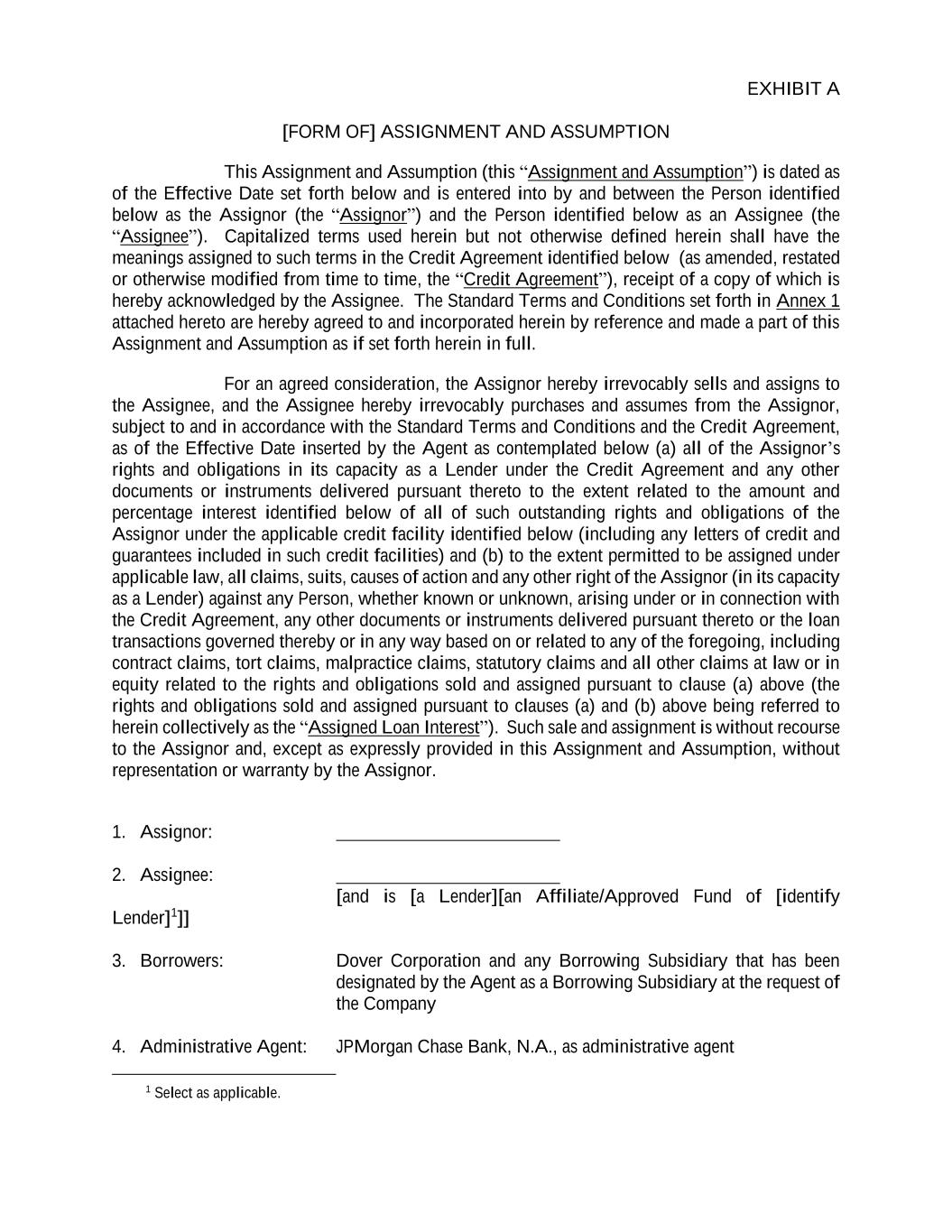 EXHIBIT A [FORM OF] ASSIGNMENT AND ASSUMPTION This Assignment and Assumption (this “Assignment and Assumption”) is dated as of the Effective Date set forth below and is entered into by and between the Person identified below as the Assignor (the “Assignor”) and the Person identified below as an Assignee (the “Assignee”). Capitalized terms used herein but not otherwise defined herein shall have the meanings assigned to such terms in the Credit Agreement identified below (as amended, restated or otherwise modified from time to time, the “Credit Agreement”), receipt of a copy of which is hereby acknowledged by the Assignee. The Standard Terms and Conditions set forth in Annex 1 attached hereto are hereby agreed to and incorporated herein by reference and made a part of this Assignment and Assumption as if set forth herein in full. For an agreed consideration, the Assignor hereby irrevocably sells and assigns to the Assignee, and the Assignee hereby irrevocably purchases and assumes from the Assignor, subject to and in accordance with the Standard Terms and Conditions and the Credit Agreement, as of the Effective Date inserted by the Agent as contemplated below (a) all of the Assignor’s rights and obligations in its capacity as a Lender under the Credit Agreement and any other documents or instruments delivered pursuant thereto to the extent related to the amount and percentage interest identified below of all of such outstanding rights and obligations of the Assignor under the applicable credit facility identified below (including any letters of credit and guarantees included in such credit facilities) and (b) to the extent permitted to be assigned under applicable law, all claims, suits, causes of action and any other right of the Assignor (in its capacity as a Lender) against any Person, whether known or unknown, arising under or in connection with the Credit Agreement, any other documents or instruments delivered pursuant thereto or the loan transactions governed thereby or in any way based on or related to any of the foregoing, including contract claims, tort claims, malpractice claims, statutory claims and all other claims at law or in equity related to the rights and obligations sold and assigned pursuant to clause (a) above (the rights and obligations sold and assigned pursuant to clauses (a) and (b) above being referred to herein collectively as the “Assigned Loan Interest”). Such sale and assignment is without recourse to the Assignor and, except as expressly provided in this Assignment and Assumption, without representation or warranty by the Assignor. 1. Assignor: 2. Assignee: [and is [a Lender][an Affiliate/Approved Fund of [identify Lender]1]] 3. Borrowers: Dover Corporation and any Borrowing Subsidiary that has been designated by the Agent as a Borrowing Subsidiary at the request of the Company 4. Administrative Agent: JPMorgan Chase Bank, N.A., as administrative agent 1 Select as applicable.