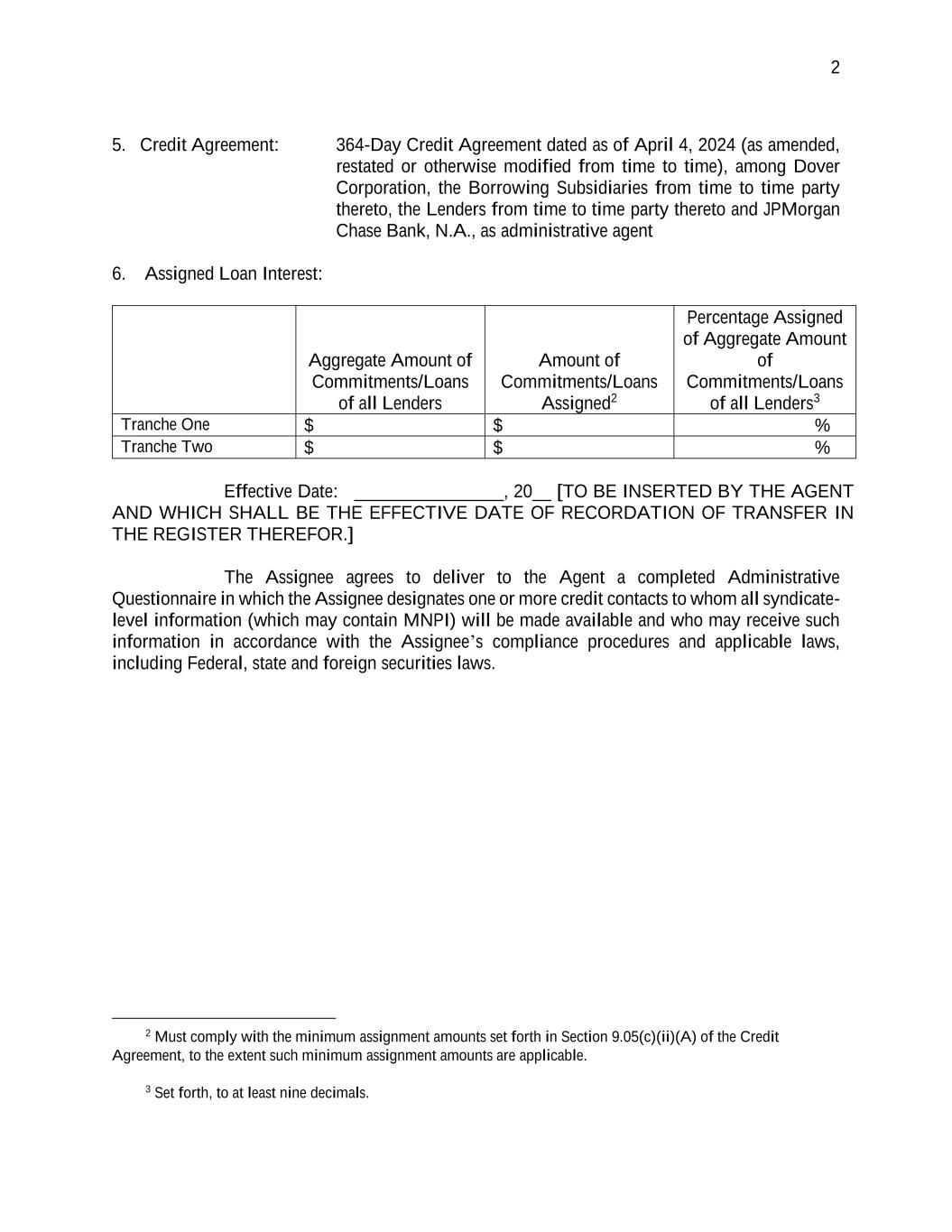 2 5. Credit Agreement: 364-Day Credit Agreement dated as of April 4, 2024 (as amended, restated or otherwise modified from time to time), among Dover Corporation, the Borrowing Subsidiaries from time to time party thereto, the Lenders from time to time party thereto and JPMorgan Chase Bank, N.A., as administrative agent 6. Assigned Loan Interest: Aggregate Amount of Commitments/Loans of all Lenders Amount of Commitments/Loans Assigned2 Percentage Assigned of Aggregate Amount of Commitments/Loans of all Lenders3 Tranche One $ $ % Tranche Two $ $ % Effective Date: ________________, 20__ [TO BE INSERTED BY THE AGENT AND WHICH SHALL BE THE EFFECTIVE DATE OF RECORDATION OF TRANSFER IN THE REGISTER THEREFOR.] The Assignee agrees to deliver to the Agent a completed Administrative Questionnaire in which the Assignee designates one or more credit contacts to whom all syndicate- level information (which may contain MNPI) will be made available and who may receive such information in accordance with the Assignee’s compliance procedures and applicable laws, including Federal, state and foreign securities laws. 2 Must comply with the minimum assignment amounts set forth in Section 9.05(c)(ii)(A) of the Credit Agreement, to the extent such minimum assignment amounts are applicable. 3 Set forth, to at least nine decimals.