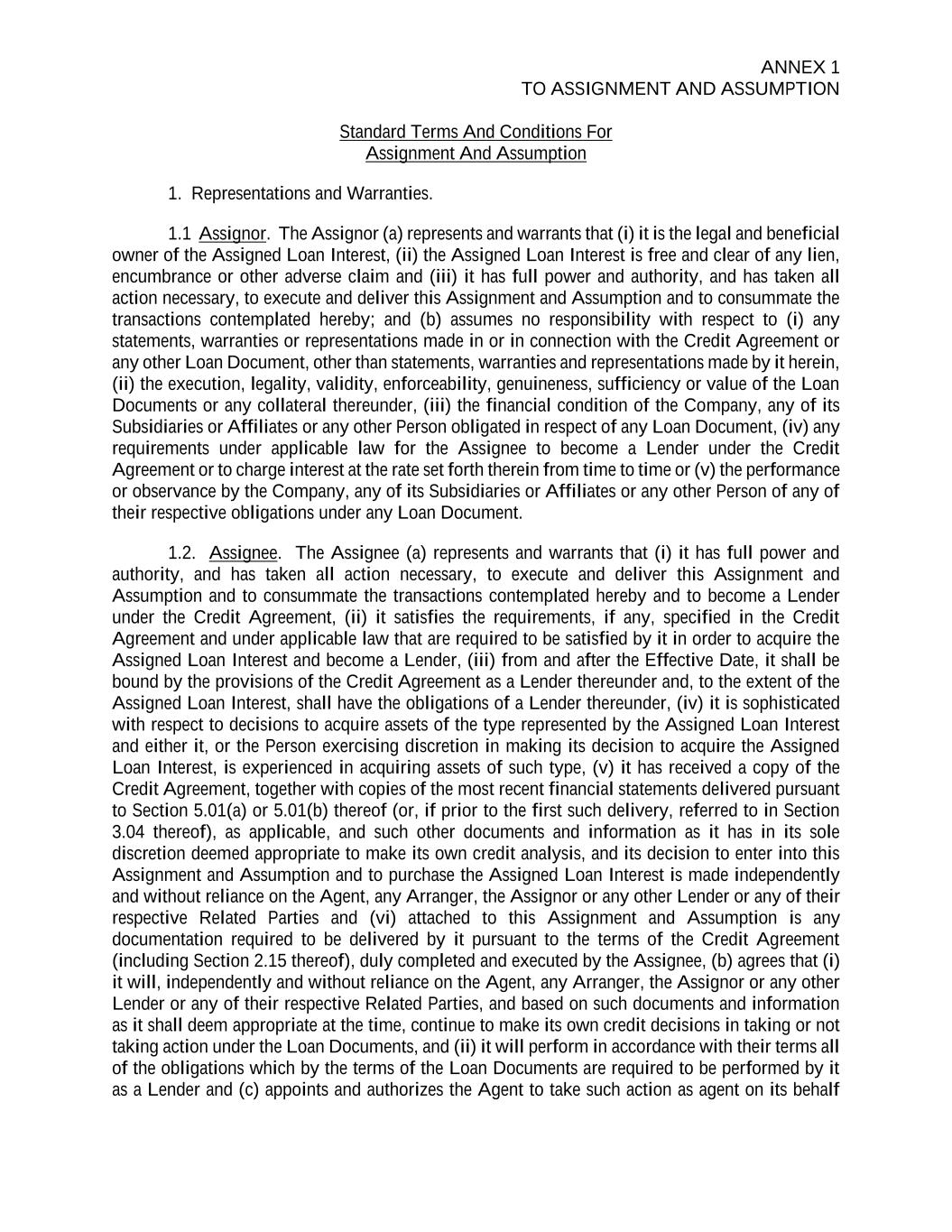 ANNEX 1 TO ASSIGNMENT AND ASSUMPTION Standard Terms And Conditions For Assignment And Assumption 1. Representations and Warranties. 1.1 Assignor. The Assignor (a) represents and warrants that (i) it is the legal and beneficial owner of the Assigned Loan Interest, (ii) the Assigned Loan Interest is free and clear of any lien, encumbrance or other adverse claim and (iii) it has full power and authority, and has taken all action necessary, to execute and deliver this Assignment and Assumption and to consummate the transactions contemplated hereby; and (b) assumes no responsibility with respect to (i) any statements, warranties or representations made in or in connection with the Credit Agreement or any other Loan Document, other than statements, warranties and representations made by it herein, (ii) the execution, legality, validity, enforceability, genuineness, sufficiency or value of the Loan Documents or any collateral thereunder, (iii) the financial condition of the Company, any of its Subsidiaries or Affiliates or any other Person obligated in respect of any Loan Document, (iv) any requirements under applicable law for the Assignee to become a Lender under the Credit Agreement or to charge interest at the rate set forth therein from time to time or (v) the performance or observance by the Company, any of its Subsidiaries or Affiliates or any other Person of any of their respective obligations under any Loan Document. 1.2. Assignee. The Assignee (a) represents and warrants that (i) it has full power and authority, and has taken all action necessary, to execute and deliver this Assignment and Assumption and to consummate the transactions contemplated hereby and to become a Lender under the Credit Agreement, (ii) it satisfies the requirements, if any, specified in the Credit Agreement and under applicable law that are required to be satisfied by it in order to acquire the Assigned Loan Interest and become a Lender, (iii) from and after the Effective Date, it shall be bound by the provisions of the Credit Agreement as a Lender thereunder and, to the extent of the Assigned Loan Interest, shall have the obligations of a Lender thereunder, (iv) it is sophisticated with respect to decisions to acquire assets of the type represented by the Assigned Loan Interest and either it, or the Person exercising discretion in making its decision to acquire the Assigned Loan Interest, is experienced in acquiring assets of such type, (v) it has received a copy of the Credit Agreement, together with copies of the most recent financial statements delivered pursuant to Section 5.01(a) or 5.01(b) thereof (or, if prior to the first such delivery, referred to in Section 3.04 thereof), as applicable, and such other documents and information as it has in its sole discretion deemed appropriate to make its own credit analysis, and its decision to enter into this Assignment and Assumption and to purchase the Assigned Loan Interest is made independently and without reliance on the Agent, any Arranger, the Assignor or any other Lender or any of their respective Related Parties and (vi) attached to this Assignment and Assumption is any documentation required to be delivered by it pursuant to the terms of the Credit Agreement (including Section 2.15 thereof), duly completed and executed by the Assignee, (b) agrees that (i) it will, independently and without reliance on the Agent, any Arranger, the Assignor or any other Lender or any of their respective Related Parties, and based on such documents and information as it shall deem appropriate at the time, continue to make its own credit decisions in taking or not taking action under the Loan Documents, and (ii) it will perform in accordance with their terms all of the obligations which by the terms of the Loan Documents are required to be performed by it as a Lender and (c) appoints and authorizes the Agent to take such action as agent on its behalf