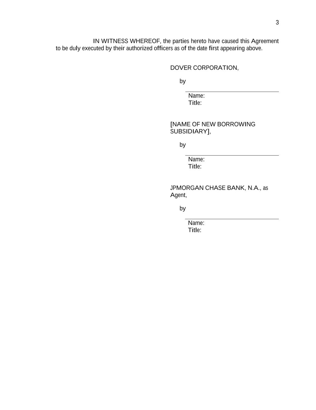 3 IN WITNESS WHEREOF, the parties hereto have caused this Agreement to be duly executed by their authorized officers as of the date first appearing above. DOVER CORPORATION, by Name: Title: [NAME OF NEW BORROWING SUBSIDIARY], by Name: Title: JPMORGAN CHASE BANK, N.A., as Agent, by Name: Title: