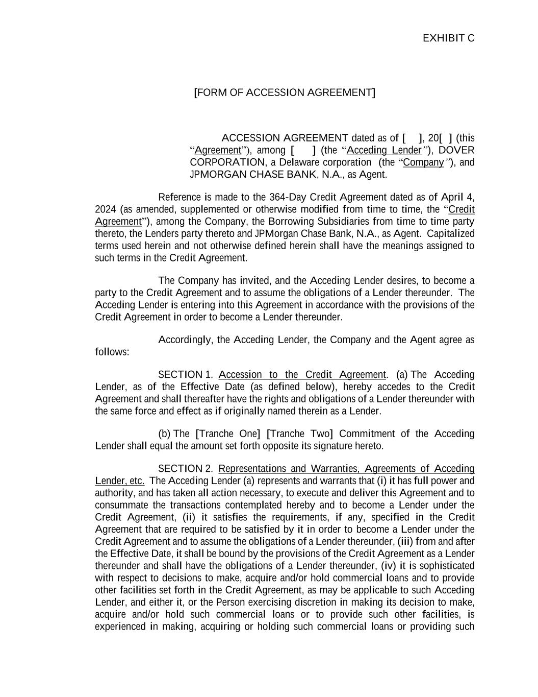 EXHIBIT C [FORM OF ACCESSION AGREEMENT] ACCESSION AGREEMENT dated as of [ ], 20[ ] (this “Agreement”), among [ ] (the “Acceding Lender”), DOVER CORPORATION, a Delaware corporation (the “Company”), and JPMORGAN CHASE BANK, N.A., as Agent. Reference is made to the 364-Day Credit Agreement dated as of April 4, 2024 (as amended, supplemented or otherwise modified from time to time, the “Credit Agreement”), among the Company, the Borrowing Subsidiaries from time to time party thereto, the Lenders party thereto and JPMorgan Chase Bank, N.A., as Agent. Capitalized terms used herein and not otherwise defined herein shall have the meanings assigned to such terms in the Credit Agreement. The Company has invited, and the Acceding Lender desires, to become a party to the Credit Agreement and to assume the obligations of a Lender thereunder. The Acceding Lender is entering into this Agreement in accordance with the provisions of the Credit Agreement in order to become a Lender thereunder. Accordingly, the Acceding Lender, the Company and the Agent agree as follows: SECTION 1. Accession to the Credit Agreement. (a) The Acceding Lender, as of the Effective Date (as defined below), hereby accedes to the Credit Agreement and shall thereafter have the rights and obligations of a Lender thereunder with the same force and effect as if originally named therein as a Lender. (b) The [Tranche One] [Tranche Two] Commitment of the Acceding Lender shall equal the amount set forth opposite its signature hereto. SECTION 2. Representations and Warranties, Agreements of Acceding Lender, etc. The Acceding Lender (a) represents and warrants that (i) it has full power and authority, and has taken all action necessary, to execute and deliver this Agreement and to consummate the transactions contemplated hereby and to become a Lender under the Credit Agreement, (ii) it satisfies the requirements, if any, specified in the Credit Agreement that are required to be satisfied by it in order to become a Lender under the Credit Agreement and to assume the obligations of a Lender thereunder, (iii) from and after the Effective Date, it shall be bound by the provisions of the Credit Agreement as a Lender thereunder and shall have the obligations of a Lender thereunder, (iv) it is sophisticated with respect to decisions to make, acquire and/or hold commercial loans and to provide other facilities set forth in the Credit Agreement, as may be applicable to such Acceding Lender, and either it, or the Person exercising discretion in making its decision to make, acquire and/or hold such commercial loans or to provide such other facilities, is experienced in making, acquiring or holding such commercial loans or providing such