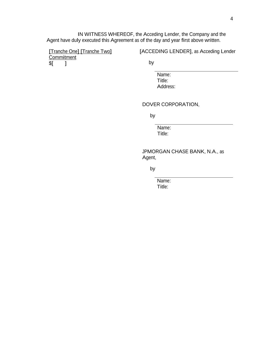 4 IN WITNESS WHEREOF, the Acceding Lender, the Company and the Agent have duly executed this Agreement as of the day and year first above written. [Tranche One] [Tranche Two] Commitment $[ ] [ACCEDING LENDER], as Acceding Lender by Name: Title: Address: DOVER CORPORATION, by Name: Title: JPMORGAN CHASE BANK, N.A., as Agent, by Name: Title: