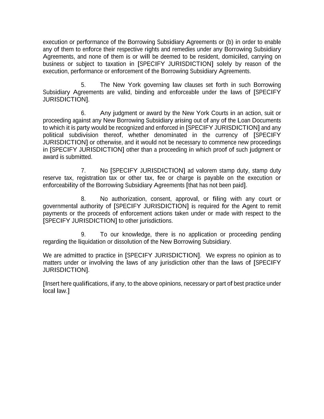 execution or performance of the Borrowing Subsidiary Agreements or (b) in order to enable any of them to enforce their respective rights and remedies under any Borrowing Subsidiary Agreements, and none of them is or will be deemed to be resident, domiciled, carrying on business or subject to taxation in [SPECIFY JURISDICTION] solely by reason of the execution, performance or enforcement of the Borrowing Subsidiary Agreements. 5. The New York governing law clauses set forth in such Borrowing Subsidiary Agreements are valid, binding and enforceable under the laws of [SPECIFY JURISDICTION]. 6. Any judgment or award by the New York Courts in an action, suit or proceeding against any New Borrowing Subsidiary arising out of any of the Loan Documents to which it is party would be recognized and enforced in [SPECIFY JURISDICTION] and any political subdivision thereof, whether denominated in the currency of [SPECIFY JURISDICTION] or otherwise, and it would not be necessary to commence new proceedings in [SPECIFY JURISDICTION] other than a proceeding in which proof of such judgment or award is submitted. 7. No [SPECIFY JURISDICTION] ad valorem stamp duty, stamp duty reserve tax, registration tax or other tax, fee or charge is payable on the execution or enforceability of the Borrowing Subsidiary Agreements [that has not been paid]. 8. No authorization, consent, approval, or filing with any court or governmental authority of [SPECIFY JURISDICTION] is required for the Agent to remit payments or the proceeds of enforcement actions taken under or made with respect to the [SPECIFY JURISDICTION] to other jurisdictions. 9. To our knowledge, there is no application or proceeding pending regarding the liquidation or dissolution of the New Borrowing Subsidiary. We are admitted to practice in [SPECIFY JURISDICTION]. We express no opinion as to matters under or involving the laws of any jurisdiction other than the laws of [SPECIFY JURISDICTION]. [Insert here qualifications, if any, to the above opinions, necessary or part of best practice under local law.]