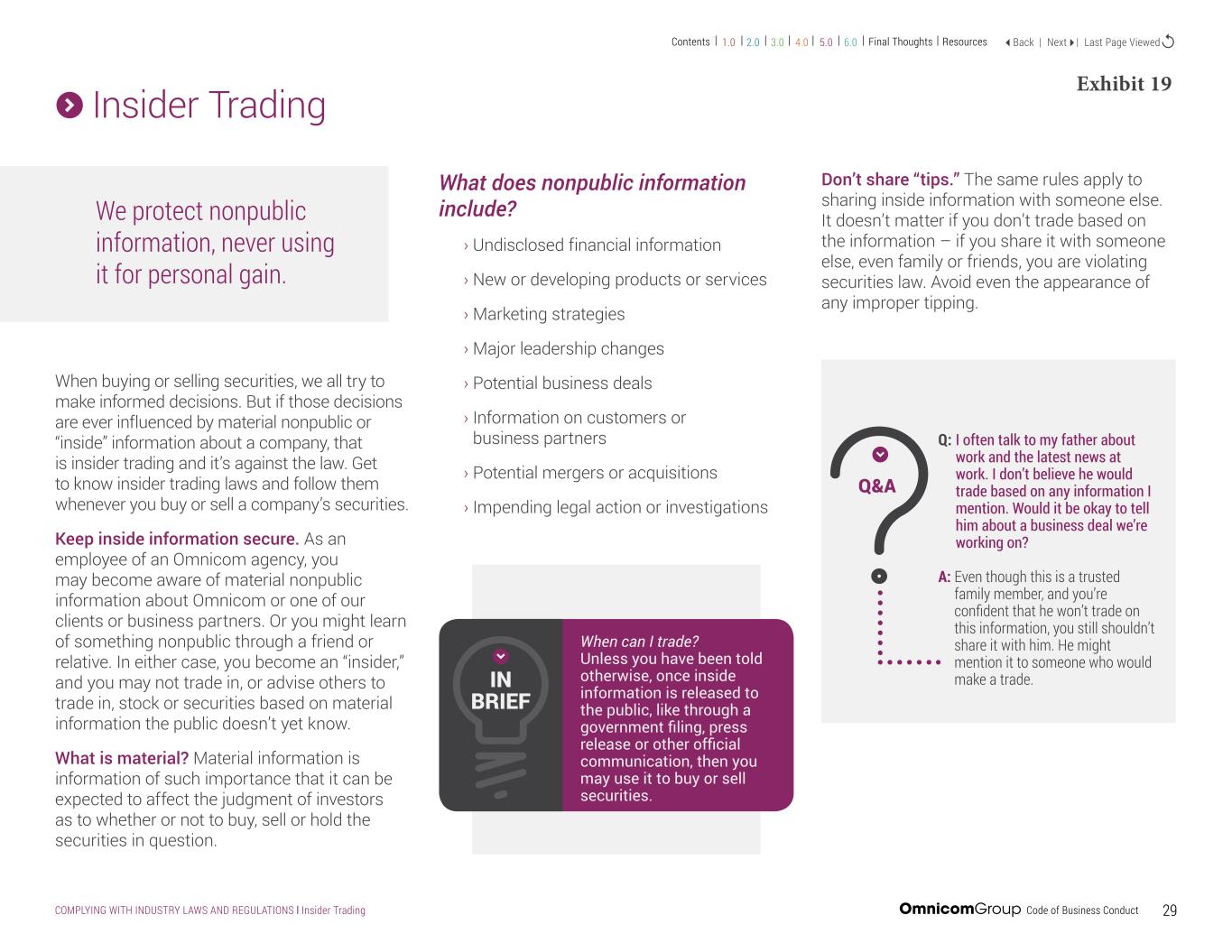 Insider Trading We protect nonpublic information, never using it for personal gain. COMPLYING WITH INDUSTRY LAWS AND REGULATIONS l Insider Trading When buying or selling securities, we all try to make informed decisions. But if those decisions are ever influenced by material nonpublic or “inside” information about a company, that is insider trading and it’s against the law. Get to know insider trading laws and follow them whenever you buy or sell a company’s securities. Keep inside information secure. As an employee of an Omnicom agency, you may become aware of material nonpublic information about Omnicom or one of our clients or business partners. Or you might learn of something nonpublic through a friend or relative. In either case, you become an “insider,” and you may not trade in, or advise others to trade in, stock or securities based on material information the public doesn’t yet know. What is material? Material information is information of such importance that it can be expected to affect the judgment of investors as to whether or not to buy, sell or hold the securities in question. What does nonpublic information include? › Undisclosed financial information › New or developing products or services › Marketing strategies › Major leadership changes › Potential business deals › Information on customers or business partners › Potential mergers or acquisitions › Impending legal action or investigations Q: I often talk to my father about work and the latest news at work. I don’t believe he would trade based on any information I mention. Would it be okay to tell him about a business deal we’re working on? A: Even though this is a trusted family member, and you’re confident that he won’t trade on this information, you still shouldn’t share it with him. He might mention it to someone who would make a trade. Q&A When can I trade? Unless you have been told otherwise, once inside information is released to the public, like through a government filing, press release or other official communication, then you may use it to buy or sell securities. IN BRIEF Don’t share “tips.” The same rules apply to sharing inside information with someone else. It doesn’t matter if you don’t trade based on the information – if you share it with someone else, even family or friends, you are violating securities law. Avoid even the appearance of any improper tipping. 29Code of Business Conduct Contents Final Thoughts Resources1.0 2.0 3.0 4.0 5.0 6.0 Back Next Exhibit 19