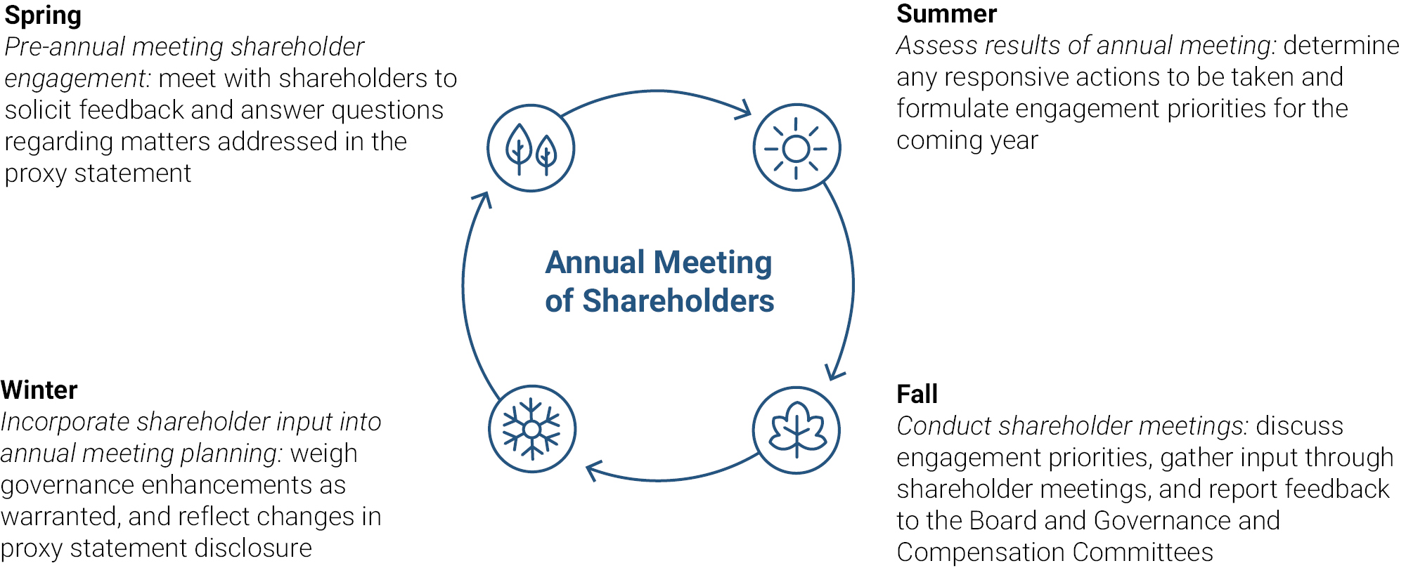 Continued Commitment to Shareholder Engagement and Responsiveness. Shareholder engagement remains an essential part of our Board’s and management’s evaluation process, and we value our shareholders’ perspectives on all topics, including governance practices and ESG policies and disclosures. Omnicom has a long-standing track record of incorporating shareholder perspectives into the Board’s discussions and decision-making process, and in 2022 we specifically sought input from shareholders on our Board leadership structure. Shareholders provided strong support for our planned transition for the Lead Independent Director role and the Board’s ability to maintain flexibility to determine the appropriate Board leadership structure. We look forward to continued engagement with our shareholders on these and other topics in the coming year.