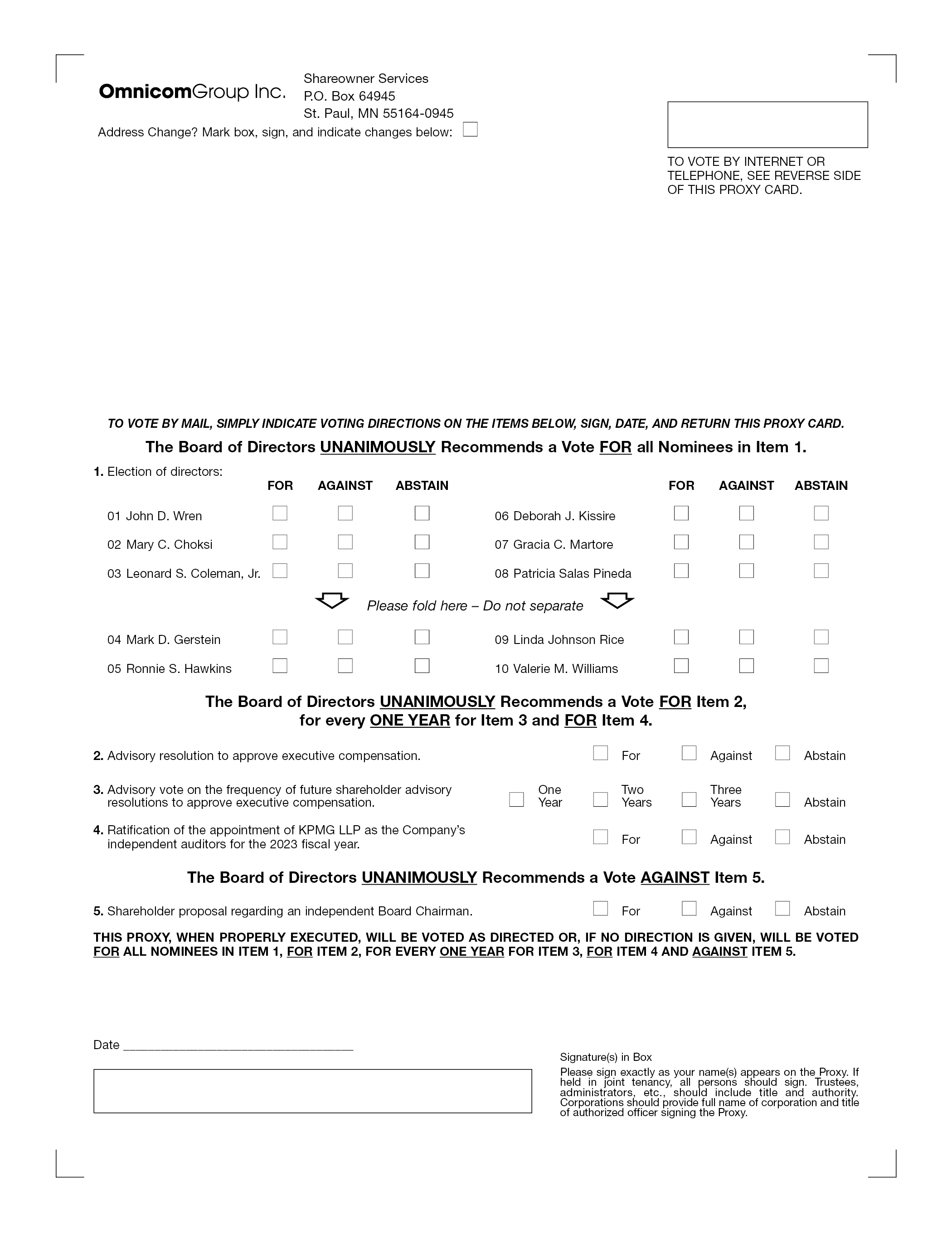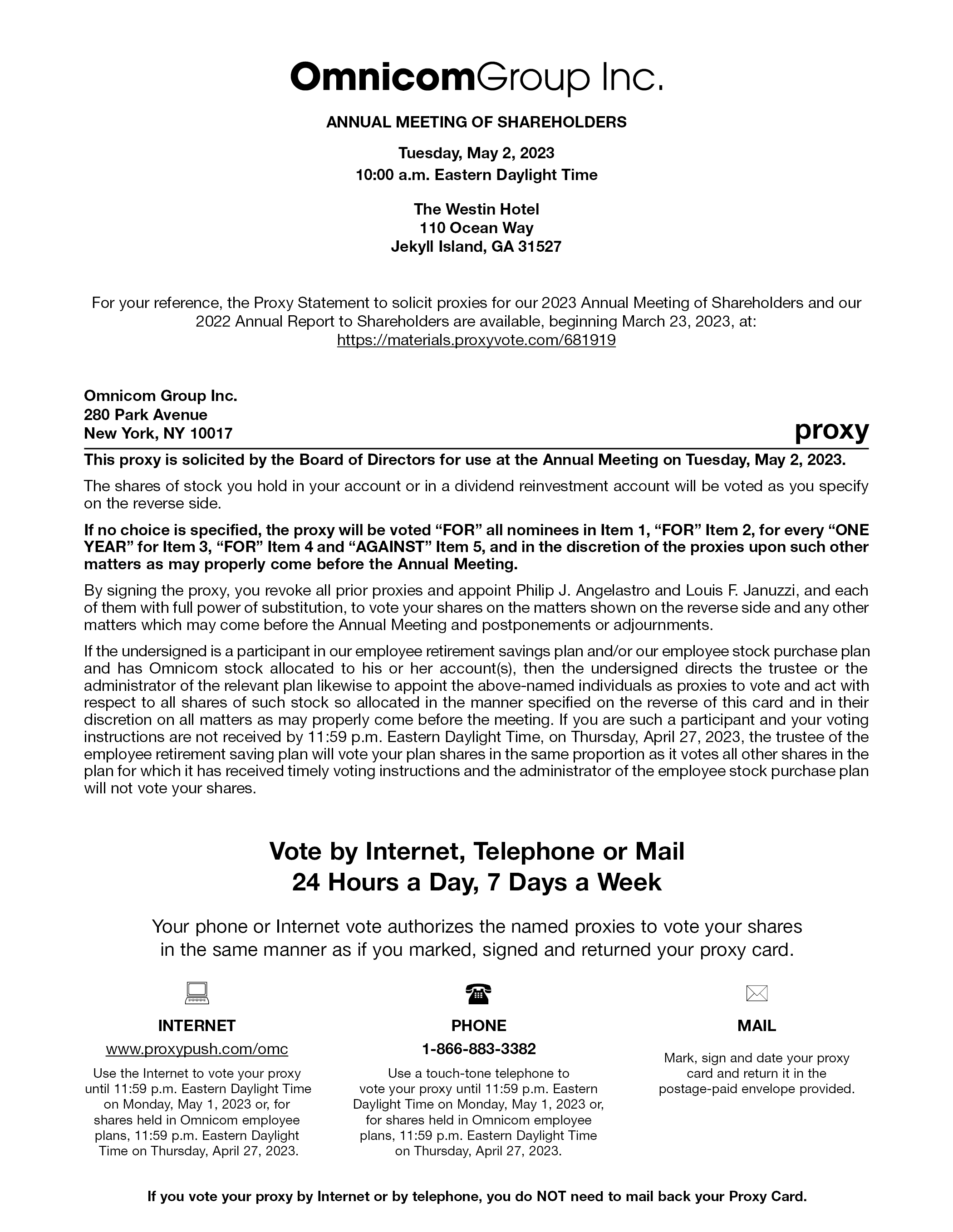 ANNUAL MEETING OF SHAREHOLDERS Tuesday, May 2, 2023 10:00 a.m. Eastern Daylight Time The Westin Hotel 110 Ocean Way Jekyll Island, GA 31527 For your reference, the Proxy Statement to solicit proxies for our 2023 Annual Meeting of Shareholders and our 2022 Annual Report to Shareholders are available, beginning March 23, 2023, at: https://materials.proxyvote.com/681919 Omnicom Group Inc. 280 Park Avenue New York, NY 10017 proxy This proxy is solicited by the Board of Directors for use at the Annual Meeting on Tuesday, May 2, 2023. The shares of stock you hold in your account or in a dividend reinvestment account will be voted as you specify on the reverse side. If no choice is specified, the proxy will be voted “FOR” all nominees in Item 1, “FOR” Item 2, for every “ONE YEAR” for Item 3, “FOR” Item 4 and “AGAINST” Item 5, and in the discretion of the proxies upon such other matters as may properly come before the Annual Meeting. By signing the proxy, you revoke all prior proxies and appoint Philip J. Angelastro and Louis F. Januzzi, and each of them with full power of substitution, to vote your shares on the matters shown on the reverse side and any other matters which may come before the Annual Meeting and postponements or adjournments. If the undersigned is a participant in our employee retirement savings plan and/or our employee stock purchase plan and has Omnicom stock allocated to his or her account(s), then the undersigned directs the trustee or the administrator of the relevant plan likewise to appoint the above-named individuals as proxies to vote and act with respect to all shares of such stock so allocated in the manner specified on the reverse of this card and in their discretion on all matters as may properly come before the meeting. If you are such a participant and your voting instructions are not received by 11:59 p.m. Eastern Daylight Time, on Thursday, April 27, 2023, the trustee of the employee retirement saving plan will vote your plan shares in the same proportion as it votes all other shares in the plan for which it has received timely voting instructions and the administrator of the employee stock purchase plan will not vote your shares. Vote by Internet, Telephone or Mail 24 Hours a Day, 7 Days a Week Your phone or Internet vote authorizes the named proxies to vote your shares in the same manner as if you marked, signed and returned your proxy card. INTERNET PHONE MAIL www.proxypush.com/omc 1-866-883-3382 Mark, sign and date your proxy Use the Internet to vote your proxy Use a touch-tone telephone to card and return it in the until 11:59 p.m. Eastern Daylight Time vote your proxy until 11:59 p.m. Eastern postage-paid envelope provided. on Monday, May 1, 2023 or, for Daylight Time on Monday, May 1, 2023 or, shares held in Omnicom employee for shares held in Omnicom employee plans, 11:59 p.m. Eastern Daylight plans, 11:59 p.m. Eastern Daylight Time Time on Thursday, April 27, 2023. on Thursday, April 27, 2023. If you vote your proxy by Internet or by telephone, you do NOT need to mail back your Proxy Card.