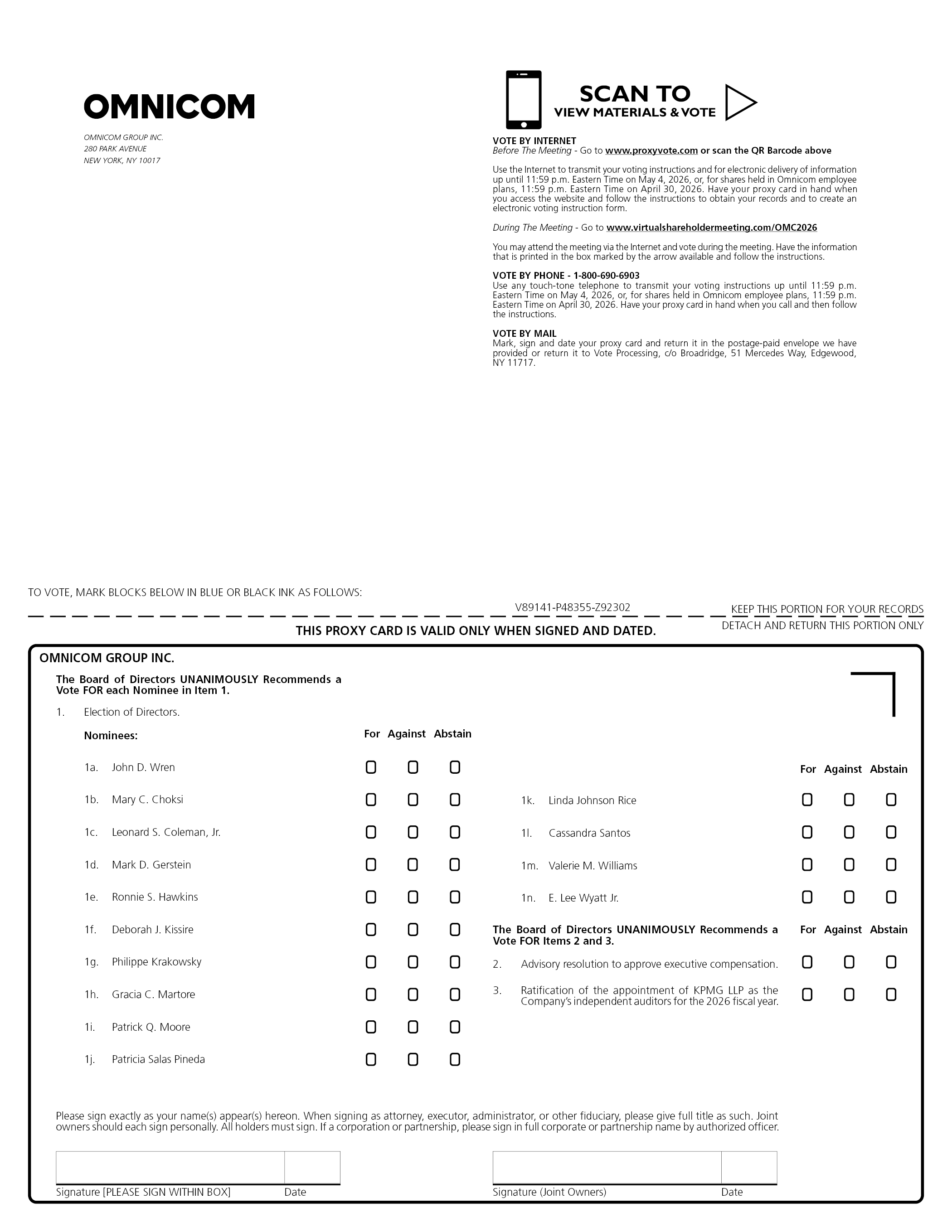 OMNICOM GROUP INC. 280 PARK AVENUE NEW YORK, NY 10017 SCAN TO VIEW MATERIALS & VOTE VOTE BY INTERNET Before The Meeting - Go to www.proxyvote.com or scan the QR Barcode above Use the Internet to transmit your voting instructions and for electronic delivery of information up until 11:59 p.m. Eastern Time on May 4, 2026, or, for shares held in Omnicom employee plans, 11:59 p.m. Eastern Time on April 30, 2026. Have your proxy card in hand when you access the website and follow the instructions to obtain your records and to create an electronic voting instruction form. During The Meeting - Go to www.virtualshareholdermeeting.com/OMC2026 You may attend the meeting via the Internet and vote during the meeting. Have the information that is printed in the box marked by the arrow available and follow the instructions. VOTE BY PHONE - 1-800-690-6903 Use any touch-tone telephone to transmit your voting instructions up until 11:59 p.m. Eastern Time on May 4, 2026, or, for shares held in Omnicom employee plans, 11:59 p.m. Eastern Time on April 30, 2026. Have your proxy card in hand when you call and then follow the instructions. VOTE BY MAIL Mark, sign and date your proxy card and return it in the postage-paid envelope we have provided or return it to Vote Processing, c/o Broadridge, 51 Mercedes Way, Edgewood, NY 11717. TO VOTE, MARK BLOCKS BELOW IN BLUE OR BLACK INK AS FOLLOWS: V89141-P48355-Z92302 KEEP THIS PORTION FOR YOUR RECORDS DETACH AND RETURN THIS PORTION ONLY THIS PROXY CARD IS VALID ONLY WHEN SIGNED AND DATED. OMNICOM GROUP INC. The Board of Directors UNANIMOUSLY Recommends a Vote FOR each Nominee in Item 1. 1. Election of Directors. Nominees: For Against Abstain 1a. John D. Wren 1b. Mary C. Choksi 1c. Leonard S. Coleman, Jr. 1d. Mark D. Gerstein 1e. Ronnie S. Hawkins 1f. Deborah J. Kissire 1g. Philippe Krakowsky 1h. Gracia C. Martore 1i. Patrick Q. Moore 1j. Patricia Salas Pineda 1k. Linda Johnson Rice 1l. Cassandra Santos 1m. Valerie M. Williams 1n. E. Lee Wyatt Jr. The Board of Directors UNANIMOUSLY Recommends a Vote FOR Items 2 and 3. 2. Advisory resolution to approve executive compensation. 3. Ratification of the appointment of KPMG LLP as the Company’s independent auditors for the 2026 fiscal year. Please sign exactly as your name(s) appear(s) hereon. When signing as attorney, executor, administrator, or other fiduciary, please give full title as such. Joint owners should each sign personally. All holders must sign. If a corporation or partnership, please sign in full corporate or partnership name by authorized officer. Signature [PLEASE SIGN WITHIN BOX] Date Signature (Joint Owners) Date