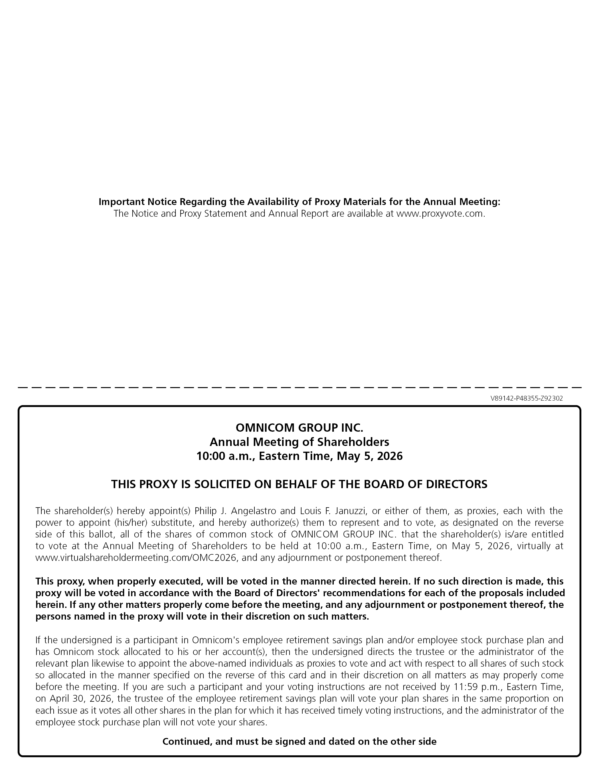 Important Notice Regarding the Availability of Proxy Materials for the Annual Meeting: The Notice and Proxy Statement and Annual Report are available at www.proxyvote.com. V89142-P48355-Z92302 OMNICOM GROUP INC. Annual Meeting of Shareholders 10:00 a.m., Eastern Time, May 5, 2026 THIS PROXY IS SOLICITED ON BEHALF OF THE BOARD OF DIRECTORS The shareholder(s) hereby appoint(s) Philip J. Angelastro and Louis F. Januzzi, or either of them, as proxies, each with the power to appoint (his/her) substitute, and hereby authorize(s) them to represent and to vote, as designated on the reverse side of this ballot, all of the shares of common stock of OMNICOM GROUP INC. that the shareholder(s) is/are entitled to vote at the Annual Meeting of Shareholders to be held at 10:00 a.m., Eastern Time, on May 5, 2026, virtually at www.virtualshareholdermeeting.com/OMC2026, and any adjournment or postponement thereof. This proxy, when properly executed, will be voted in the manner directed herein. If no such direction is made, this proxy will be voted in accordance with the Board of Directors' recommendations for each of the proposals included herein. If any other matters properly come before the meeting, and any adjournment or postponement thereof, the persons named in the proxy will vote in their discretion on such matters. If the undersigned is a participant in Omnicom's employee retirement savings plan and/or employee stock purchase plan and has Omnicom stock allocated to his or her account(s), then the undersigned directs the trustee or the administrator of the relevant plan likewise to appoint the above-named individuals as proxies to vote and act with respect to all shares of such stock so allocated in the manner specified on the reverse of this card and in their discretion on all matters as may properly come before the meeting. If you are such a participant and your voting instructions are not received by 11:59 p.m., Eastern Time, on April 30, 2026, the trustee of the employee retirement savings plan will vote your plan shares in the same proportion on each issue as it votes all other shares in the plan for which it has received timely voting instructions, and the administrator of the employee stock purchase plan will not vote your shares. Continued, and must be signed and dated on the other side