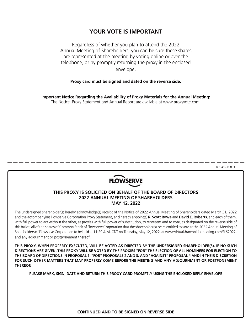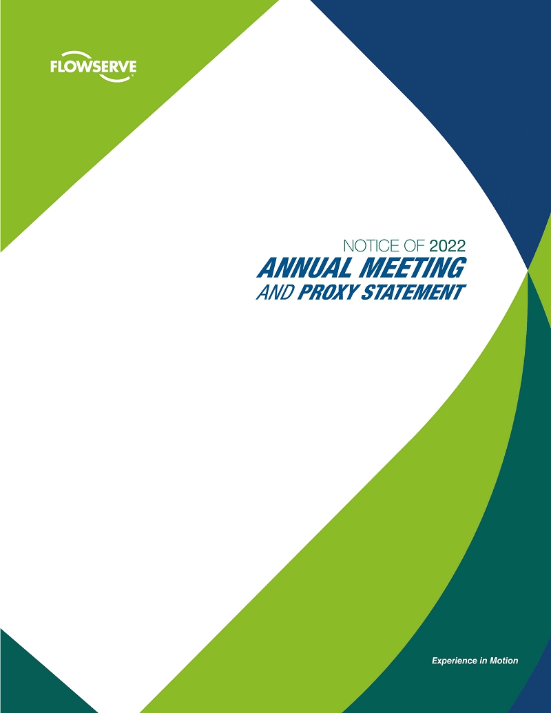 We are pleased to invite you to join our Board of Directors and senior leadership at Flowserve’s 2022 Annual Meeting of Shareholders. The 2022 Annual Meeting will be held online only and will begin at 11:30 AM CDT on May 12, 2022. We will hold the 2022 Annual Meeting solely by means of remote communications with no in-person location. You can attend the Annual Meeting and vote online at www.virtualshareholdermeeting.com/FLS2022.