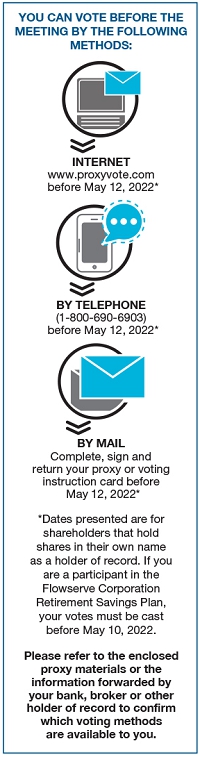 Your vote is very important. Whether or not you plan to attend the Annual Meeting online, we urge you to vote and submit your proxy in advance of the meeting by one of the methods described to the right on this page. Returning a proxy card or otherwise submitting your proxy does not deprive you of your right to attend the Annual Meeting and vote online at www.virtualshareholdermeeting.com/FLS2022.