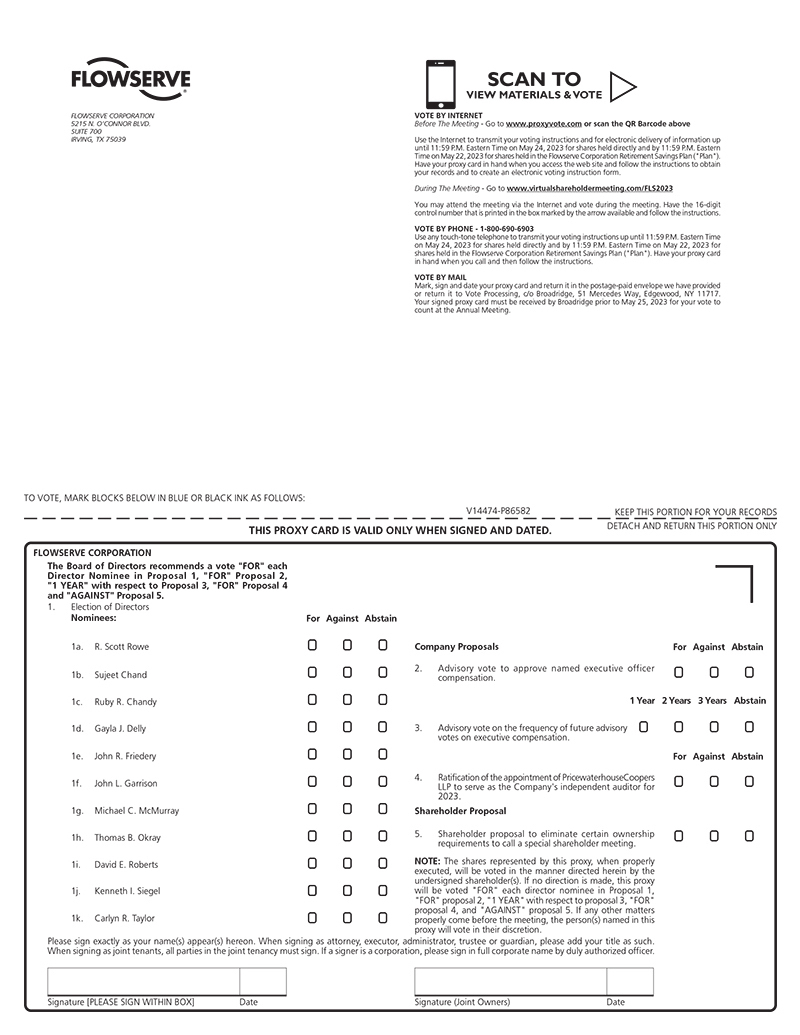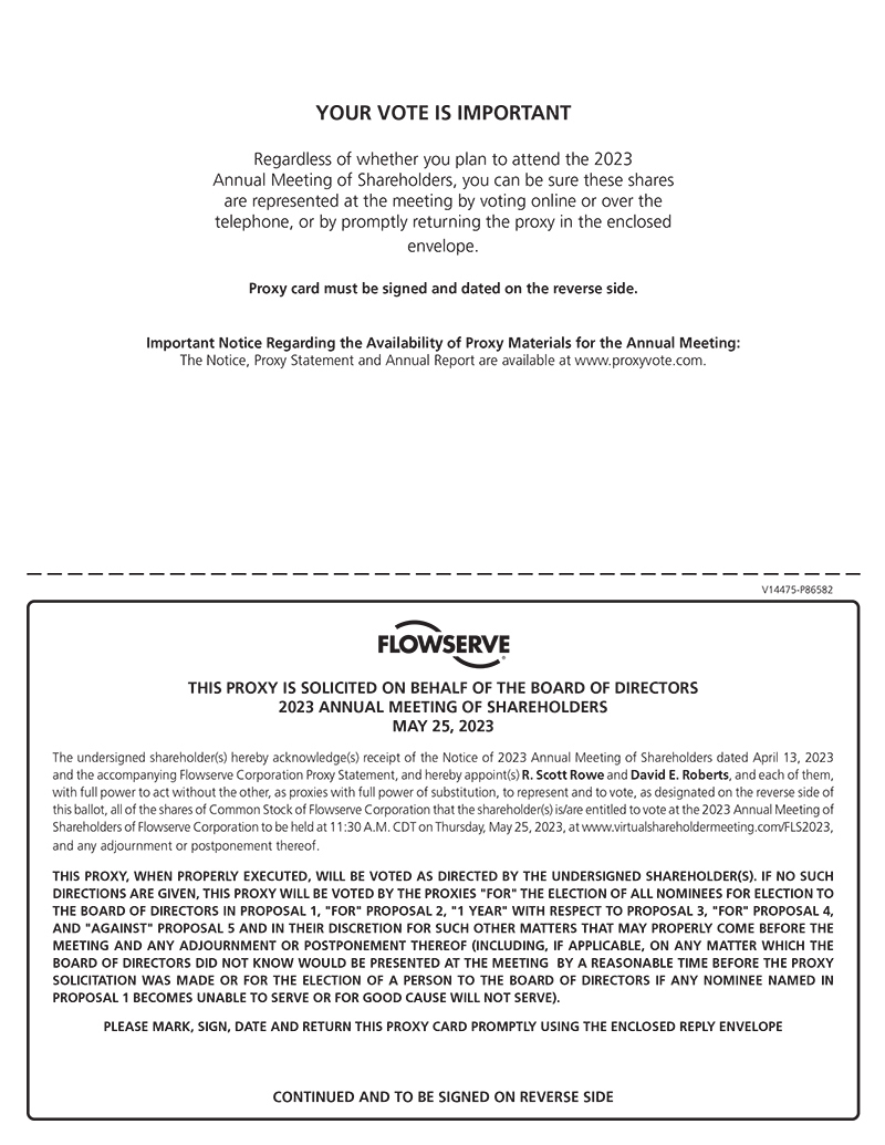 We are pleased to invite you to join our Board of Directors and senior leadership at Flowserve’s 2023 Annual Meeting of Shareholders. The 2023 Annual Meeting will be held online only and will begin at 11:30 AM CDT on May 25, 2023. We will hold the 2023 Annual Meeting solely by means of remote communications with no in-person location. You can attend the Annual Meeting and vote online at https://www.virtualshareholdermeeting.com/FLS2023.