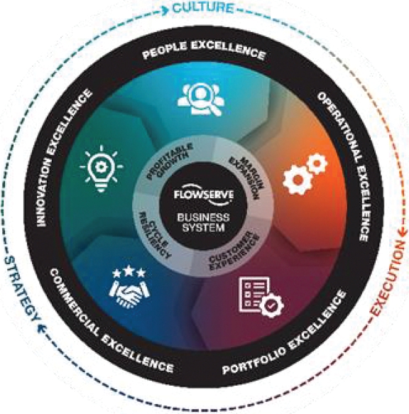 We created and launched our new Flowserve Business System in 2024 to define how we work together across five critical functional disciplines to deliver excellence in every area of the Company. It also helps us ensure that our processes drive the desired outcomes and priorities in the inner ring: profitable growth; margin expansion; cycle resiliency; and the customer experience.