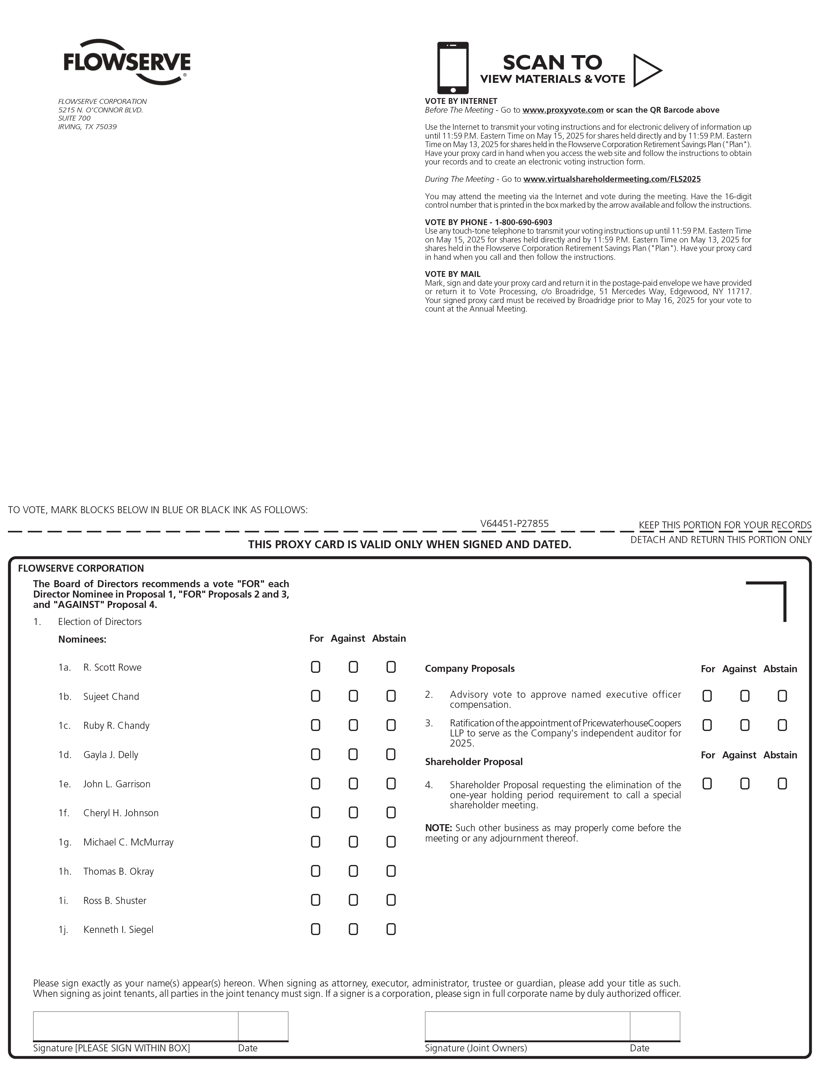 sign and *Dates presented are for shareholders that hold shares in their own name as a holder of record. If you are a participant in the Flowserve Corporation Retirement Savings Plan, your votes must be cast before May 14, 2025. Please refer to the enclosed proxy materials or the information forwarded by your bank, broker or other holder of record to confirm which voting methods are available to you. |