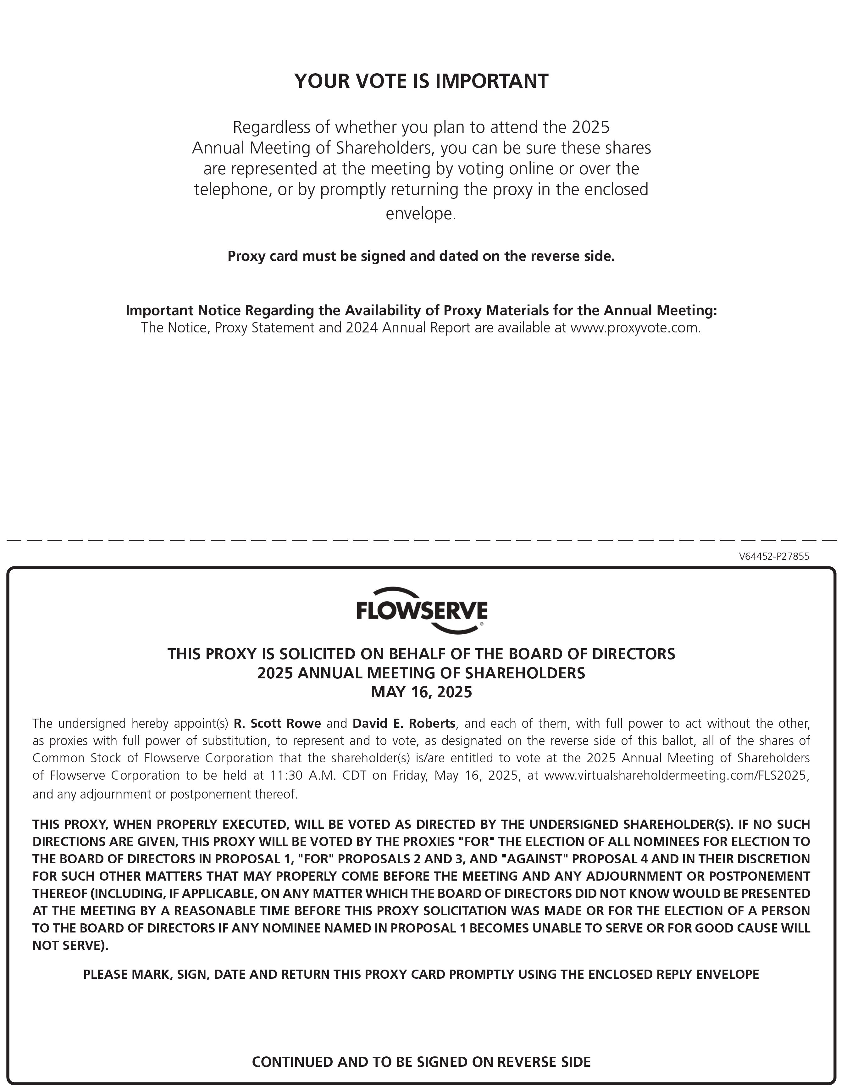 We are pleased to invite you to join our Board of Directors and senior leadership at Flowserve Corporation’s (“Flowserve” or the “Company”) 2025 Annual Meeting of Shareholders (the “Annual Meeting”). The Annual Meeting will be held online only and will begin at 11:30 a.m. CDT on May 16, 2025. We will hold the Annual Meeting solely by means of remote communications with no in-person location. You can attend the Annual Meeting and vote online at https://www.virtualshareholdermeeting.com/FLS2025.