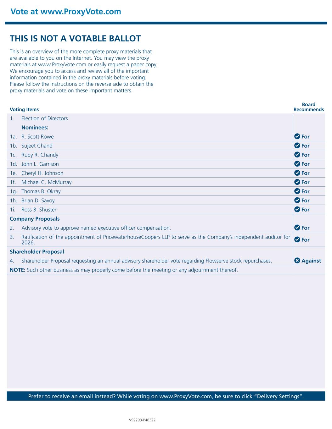 Vote at www.ProxyVote.com Prefer to receive an email instead? While voting on www.ProxyVote.com, be sure to click “Delivery Settings”. Voting Items Board Recommends V92293-P46322 THIS IS NOT A VOTABLE BALLOT This is an overview of the more complete proxy materials that are available to you on the Internet. You may view the proxy materials at www.ProxyVote.com or easily request a paper copy. We encourage you to access and review all of the important information contained in the proxy materials before voting. Please follow the instructions on the reverse side to obtain the proxy materials and vote on these important matters. 1. Election of Directors Nominees: 1a. R. Scott Rowe For 1b. Sujeet Chand For 1c. Ruby R. Chandy For 1d. John L. Garrison For 1e. Cheryl H. Johnson For 1f. Michael C. McMurray For 1g. Thomas B. Okray For 1h. Brian D. Savoy For 1i. Ross B. Shuster For Company Proposals 2. Advisory vote to approve named executive officer compensation. For 3. Ratification of the appointment of PricewaterhouseCoopers LLP to serve as the Company’s independent auditor for 2026. For Shareholder Proposal 4. Shareholder Proposal requesting an annual advisory shareholder vote regarding Flowserve stock repurchases. Against NOTE: Such other business as may properly come before the meeting or any adjournment thereof.
