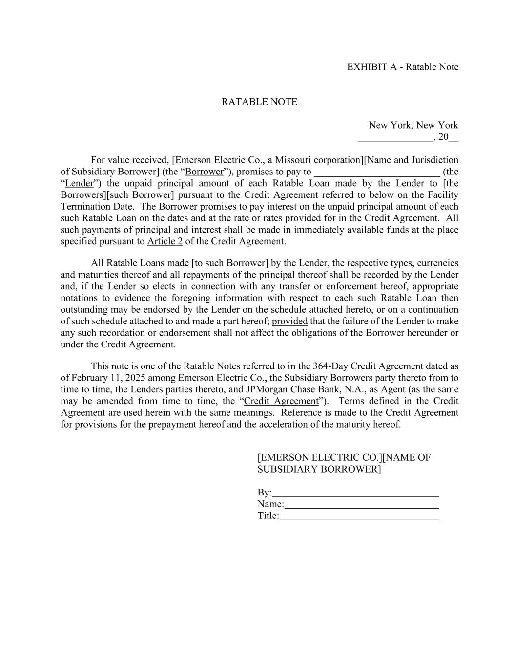 EXHIBIT A - Ratable Note RATABLE NOTE New York, New York _______________, 20__ For value received, [Emerson Electric Co., a Missouri corporation][Name and Jurisdiction of Subsidiary Borrower] (the “Borrower”), promises to pay to _________________________ (the “Lender”) the unpaid principal amount of each Ratable Loan made by the Lender to [the Borrowers][such Borrower] pursuant to the Credit Agreement referred to below on the Facility Termination Date. The Borrower promises to pay interest on the unpaid principal amount of each such Ratable Loan on the dates and at the rate or rates provided for in the Credit Agreement. All such payments of principal and interest shall be made in immediately available funds at the place specified pursuant to Article 2 of the Credit Agreement. All Ratable Loans made [to such Borrower] by the Lender, the respective types, currencies and maturities thereof and all repayments of the principal thereof shall be recorded by the Lender and, if the Lender so elects in connection with any transfer or enforcement hereof, appropriate notations to evidence the foregoing information with respect to each such Ratable Loan then outstanding may be endorsed by the Lender on the schedule attached hereto, or on a continuation of such schedule attached to and made a part hereof; provided that the failure of the Lender to make any such recordation or endorsement shall not affect the obligations of the Borrower hereunder or under the Credit Agreement. This note is one of the Ratable Notes referred to in the 364-Day Credit Agreement dated as of February 11, 2025 among Emerson Electric Co., the Subsidiary Borrowers party thereto from to time to time, the Lenders parties thereto, and JPMorgan Chase Bank, N.A., as Agent (as the same may be amended from time to time, the “Credit Agreement”). Terms defined in the Credit Agreement are used herein with the same meanings. Reference is made to the Credit Agreement for provisions for the prepayment hereof and the acceleration of the maturity hereof. [EMERSON ELECTRIC CO.][NAME OF SUBSIDIARY BORROWER] By: Name: Title:
