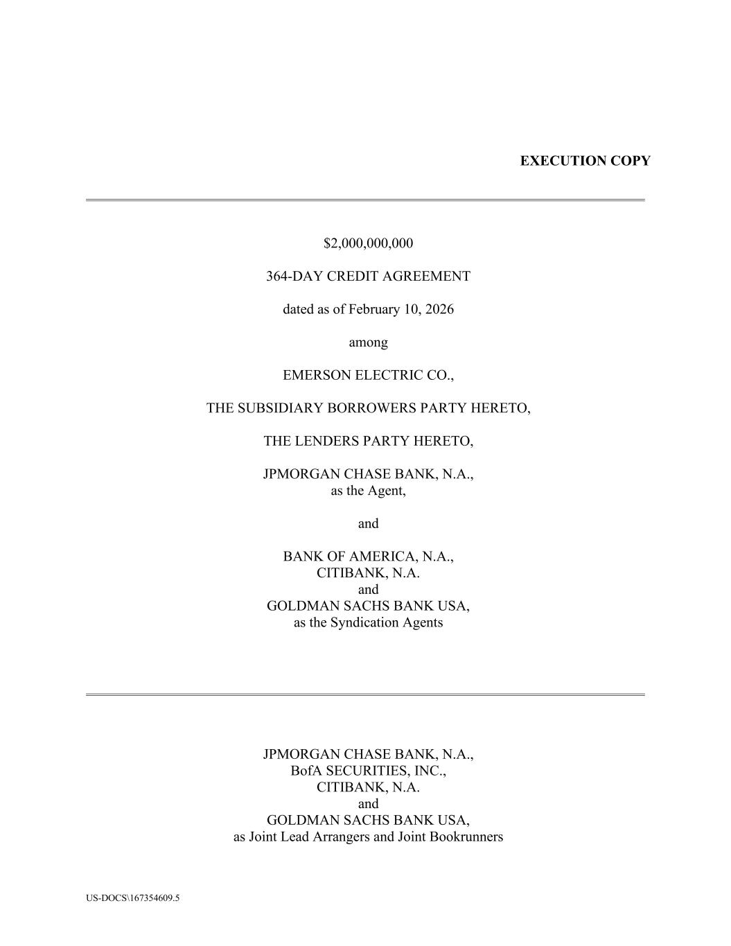 US-DOCS\167354609.5 EXECUTION COPY $2,000,000,000 364-DAY CREDIT AGREEMENT dated as of February 10, 2026 among EMERSON ELECTRIC CO., THE SUBSIDIARY BORROWERS PARTY HERETO, THE LENDERS PARTY HERETO, JPMORGAN CHASE BANK, N.A., as the Agent, and BANK OF AMERICA, N.A., CITIBANK, N.A. and GOLDMAN SACHS BANK USA, as the Syndication Agents JPMORGAN CHASE BANK, N.A., BofA SECURITIES, INC., CITIBANK, N.A. and GOLDMAN SACHS BANK USA, as Joint Lead Arrangers and Joint Bookrunners
