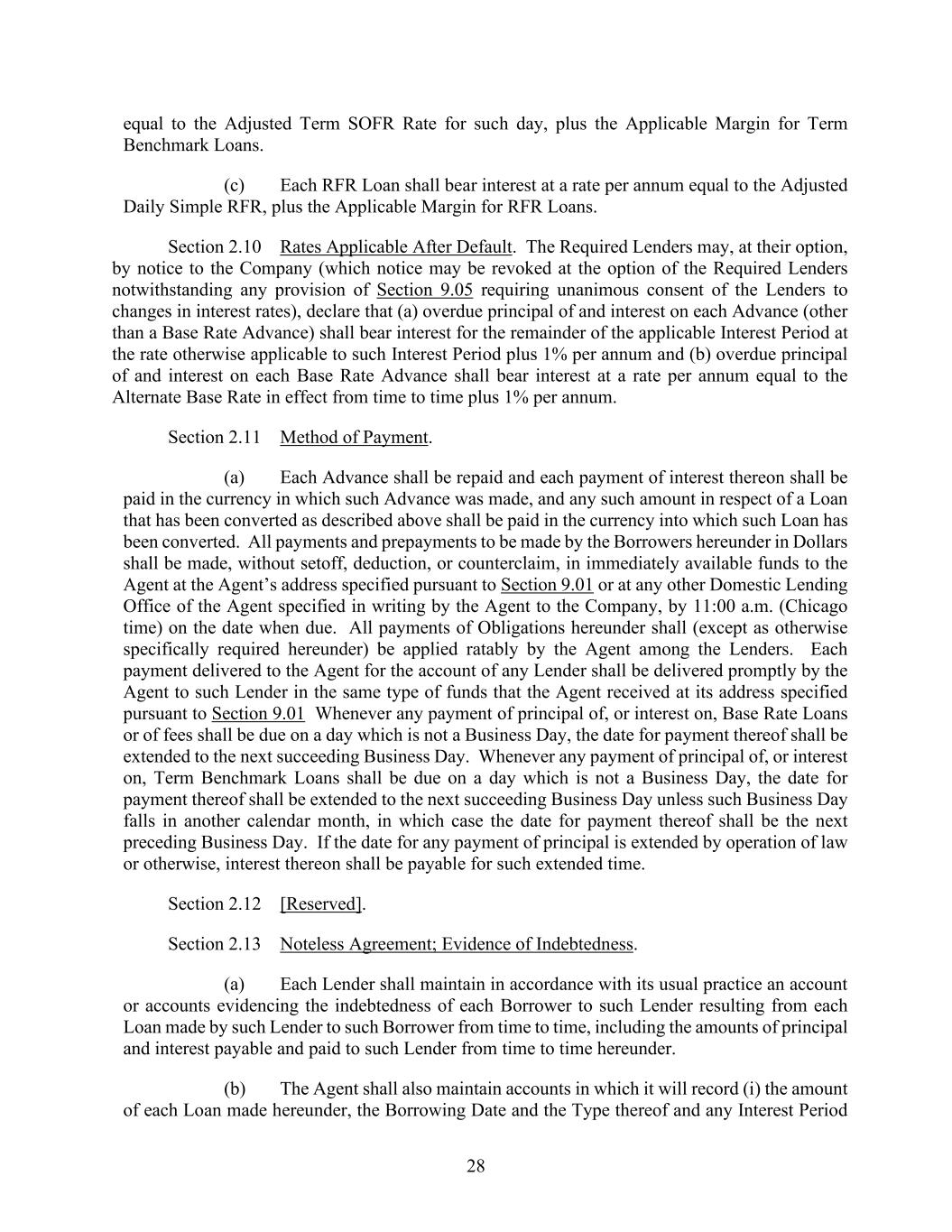 28 equal to the Adjusted Term SOFR Rate for such day, plus the Applicable Margin for Term Benchmark Loans. (c) Each RFR Loan shall bear interest at a rate per annum equal to the Adjusted Daily Simple RFR, plus the Applicable Margin for RFR Loans. Section 2.10 Rates Applicable After Default. The Required Lenders may, at their option, by notice to the Company (which notice may be revoked at the option of the Required Lenders notwithstanding any provision of Section 9.05 requiring unanimous consent of the Lenders to changes in interest rates), declare that (a) overdue principal of and interest on each Advance (other than a Base Rate Advance) shall bear interest for the remainder of the applicable Interest Period at the rate otherwise applicable to such Interest Period plus 1% per annum and (b) overdue principal of and interest on each Base Rate Advance shall bear interest at a rate per annum equal to the Alternate Base Rate in effect from time to time plus 1% per annum. Section 2.11 Method of Payment. (a) Each Advance shall be repaid and each payment of interest thereon shall be paid in the currency in which such Advance was made, and any such amount in respect of a Loan that has been converted as described above shall be paid in the currency into which such Loan has been converted. All payments and prepayments to be made by the Borrowers hereunder in Dollars shall be made, without setoff, deduction, or counterclaim, in immediately available funds to the Agent at the Agent’s address specified pursuant to Section 9.01 or at any other Domestic Lending Office of the Agent specified in writing by the Agent to the Company, by 11:00 a.m. (Chicago time) on the date when due. All payments of Obligations hereunder shall (except as otherwise specifically required hereunder) be applied ratably by the Agent among the Lenders. Each payment delivered to the Agent for the account of any Lender shall be delivered promptly by the Agent to such Lender in the same type of funds that the Agent received at its address specified pursuant to Section 9.01 Whenever any payment of principal of, or interest on, Base Rate Loans or of fees shall be due on a day which is not a Business Day, the date for payment thereof shall be extended to the next succeeding Business Day. Whenever any payment of principal of, or interest on, Term Benchmark Loans shall be due on a day which is not a Business Day, the date for payment thereof shall be extended to the next succeeding Business Day unless such Business Day falls in another calendar month, in which case the date for payment thereof shall be the next preceding Business Day. If the date for any payment of principal is extended by operation of law or otherwise, interest thereon shall be payable for such extended time. Section 2.12 [Reserved]. Section 2.13 Noteless Agreement; Evidence of Indebtedness. (a) Each Lender shall maintain in accordance with its usual practice an account or accounts evidencing the indebtedness of each Borrower to such Lender resulting from each Loan made by such Lender to such Borrower from time to time, including the amounts of principal and interest payable and paid to such Lender from time to time hereunder. (b) The Agent shall also maintain accounts in which it will record (i) the amount of each Loan made hereunder, the Borrowing Date and the Type thereof and any Interest Period