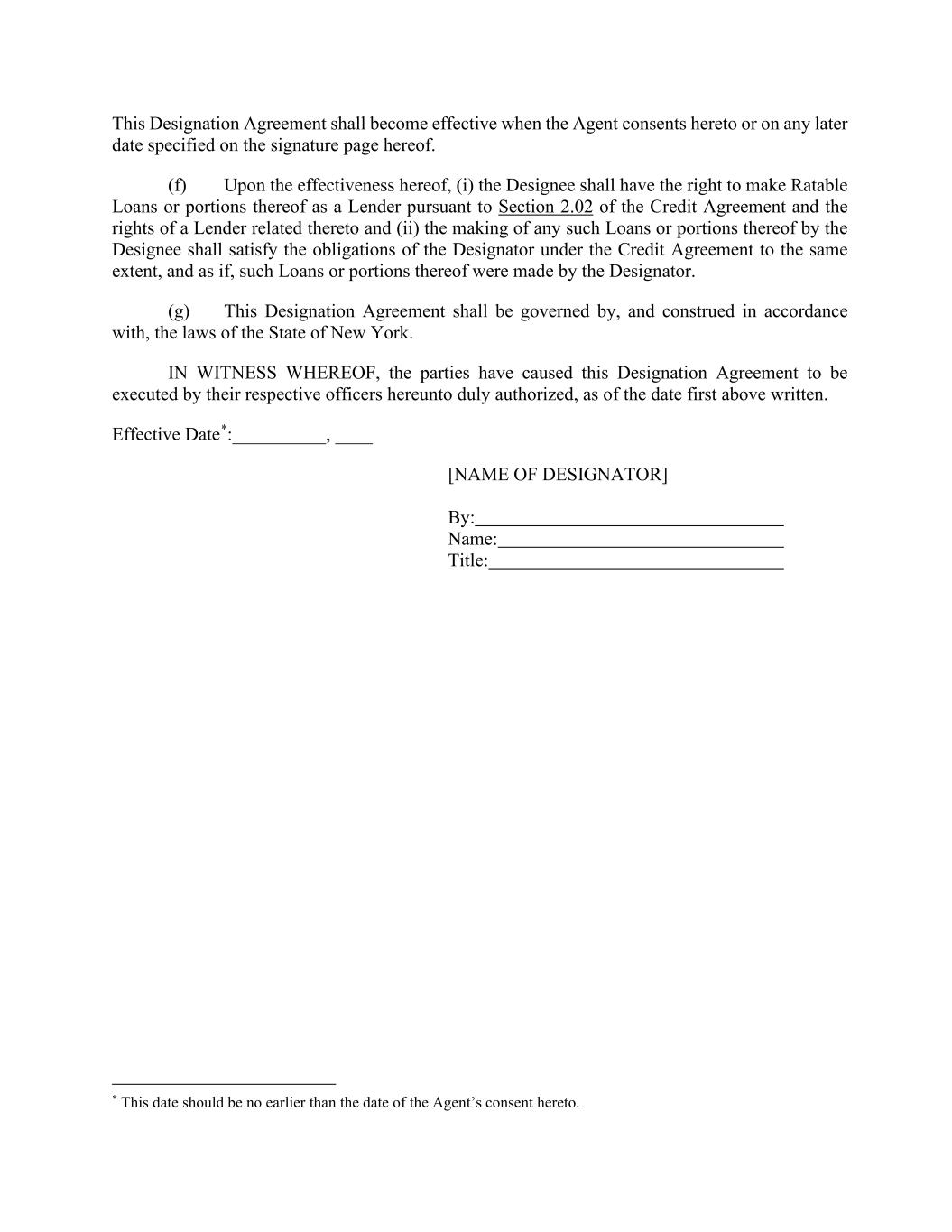 This Designation Agreement shall become effective when the Agent consents hereto or on any later date specified on the signature page hereof. (f) Upon the effectiveness hereof, (i) the Designee shall have the right to make Ratable Loans or portions thereof as a Lender pursuant to Section 2.02 of the Credit Agreement and the rights of a Lender related thereto and (ii) the making of any such Loans or portions thereof by the Designee shall satisfy the obligations of the Designator under the Credit Agreement to the same extent, and as if, such Loans or portions thereof were made by the Designator. (g) This Designation Agreement shall be governed by, and construed in accordance with, the laws of the State of New York. IN WITNESS WHEREOF, the parties have caused this Designation Agreement to be executed by their respective officers hereunto duly authorized, as of the date first above written. Effective Date*:__________, ____ [NAME OF DESIGNATOR] By: Name: Title: * This date should be no earlier than the date of the Agent’s consent hereto.