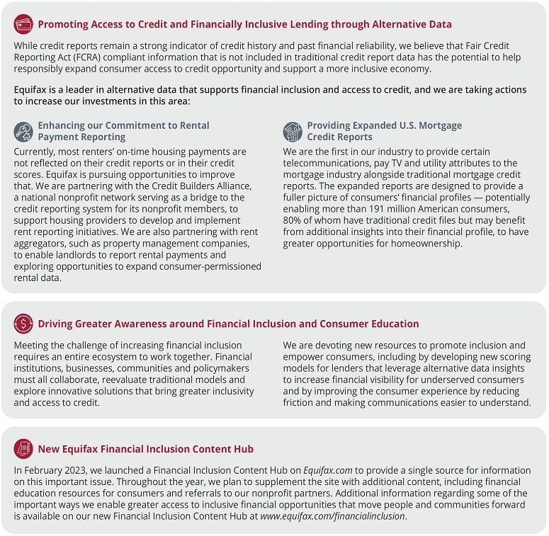 While credit reports remain a strong indicator of credit history and past financial reliability, we believe that Fair Credit Reporting Act (FCRA) compliant information that is not included in traditional credit report data has the potential to help responsibly expand consumer access to credit and support a more inclusive economy. Equifax is a leader in alternative data that supports financial inclusion and access to credit.