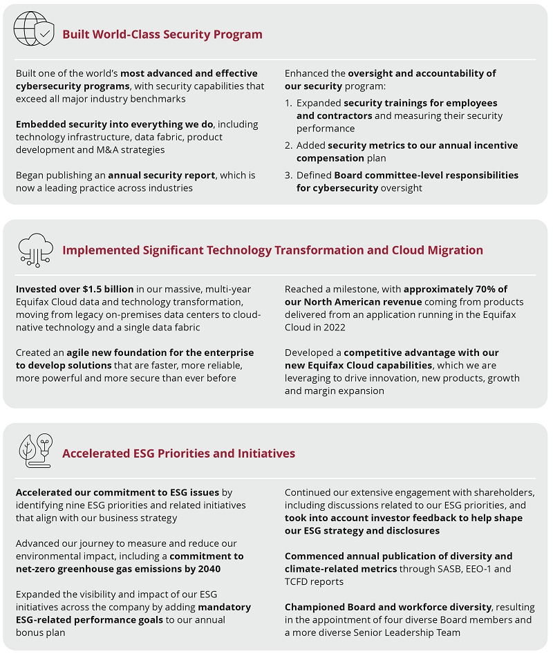 | • | The experience of our U.S. myEquifax consumer portal, which surpassed 17 million users, 5.9 million Core Credit™ subscribers, and 626,000 paid product subscribers in 2022, has evolved over the last year to include access to new offers and services, helping to simplify processes like finding auto loans on behalf of the consumers we serve. |