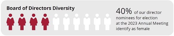 In January 2023, Equifax appointed Karen Fichuk, former Chief Executive Officer of Randstad North America, as an independent director. Fichuk’s election is part of the board’s regular succession planning process in connection with the scheduled retirement of independent director Bob Selander in May 2023. Forty percent of our director nominees for election at the 2023 Annual Meeting identify as female.