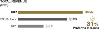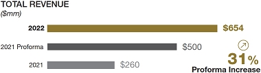 DMC’s consolidated sales increased 151% to $654.1 million from $260.1 million in 2021. Arcadia contributed $299.5 million of sales in 2022. On a pro forma basis, 2022 sales increased 31% versus 2021 sales of $500.5 million, inclusive of Arcadia. At DynaEnergetics, sales increased 51% to $264.3 million from $175.4 million in 2021. Improved oil and gas demand led to an increase in North American drilling and well-completion activity and higher unit sales of DynaEnergetics’ DS perforating systems. DynaEnergetics’ international sales also improved, increasing 35% compared with 2021. Sales at NobelClad increased 6% to $90.2 million from $84.8 million in 2021.