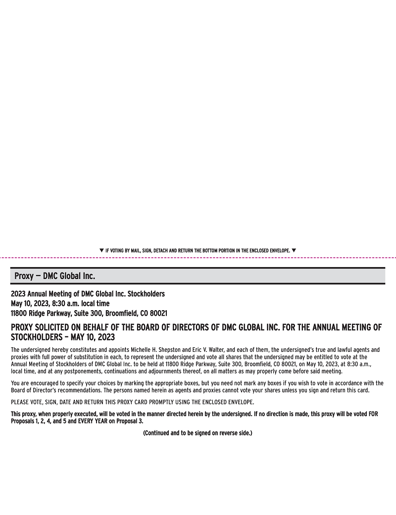 NOTICE IS HEREBY GIVEN that the Annual Meeting of Stockholders of DMC Global Inc., a Delaware corporation, will be held on May 10, 2023, at 8:30 a.m. local time at 11800 Ridge Parkway, Suite 300, Broomfield, Colorado 80021, for the following purposes: