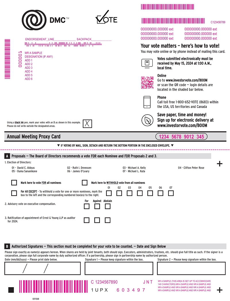 Important Notice Regarding the Availability of Proxy Materials for the Annual Meeting of Stockholders to be Held on May 15, 2024. Similar to last year, we will be using the “Notice and Access” method that allows companies to provide proxy materials to stockholders via the Internet. On or about April 2, 2024, we will mail to our stockholders a Notice of Internet Availability of Proxy Materials which contains specific instructions on how to access Annual Meeting materials via the Internet, as well as instructions on how to request paper copies. We believe this process should provide a convenient way to access your proxy materials and vote. The Proxy Statement and our annual report on Form 10-K for the fiscal year ended December 31, 2023 are available at www.investorvote.com/boom.