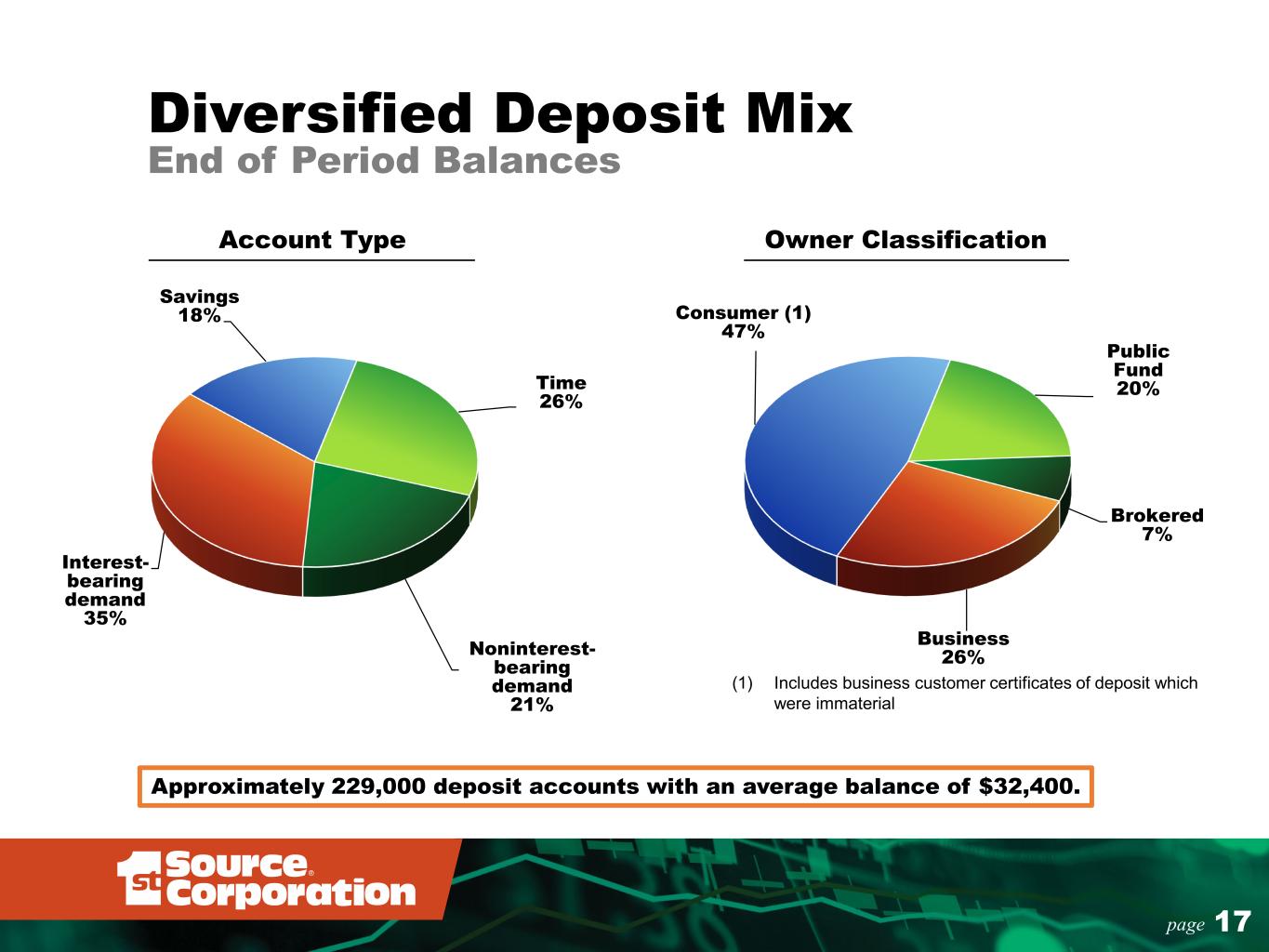 17page Time 26% Noninterest- bearing demand 21% Interest- bearing demand 35% Savings 18% Public Fund 20% Brokered 7% Business 26% Consumer (1) 47% (1) Includes business customer certificates of deposit which were immaterial Approximately 229,000 deposit accounts with an average balance of $32,400. Account Type Owner Classification Diversified Deposit Mix End of Period Balances