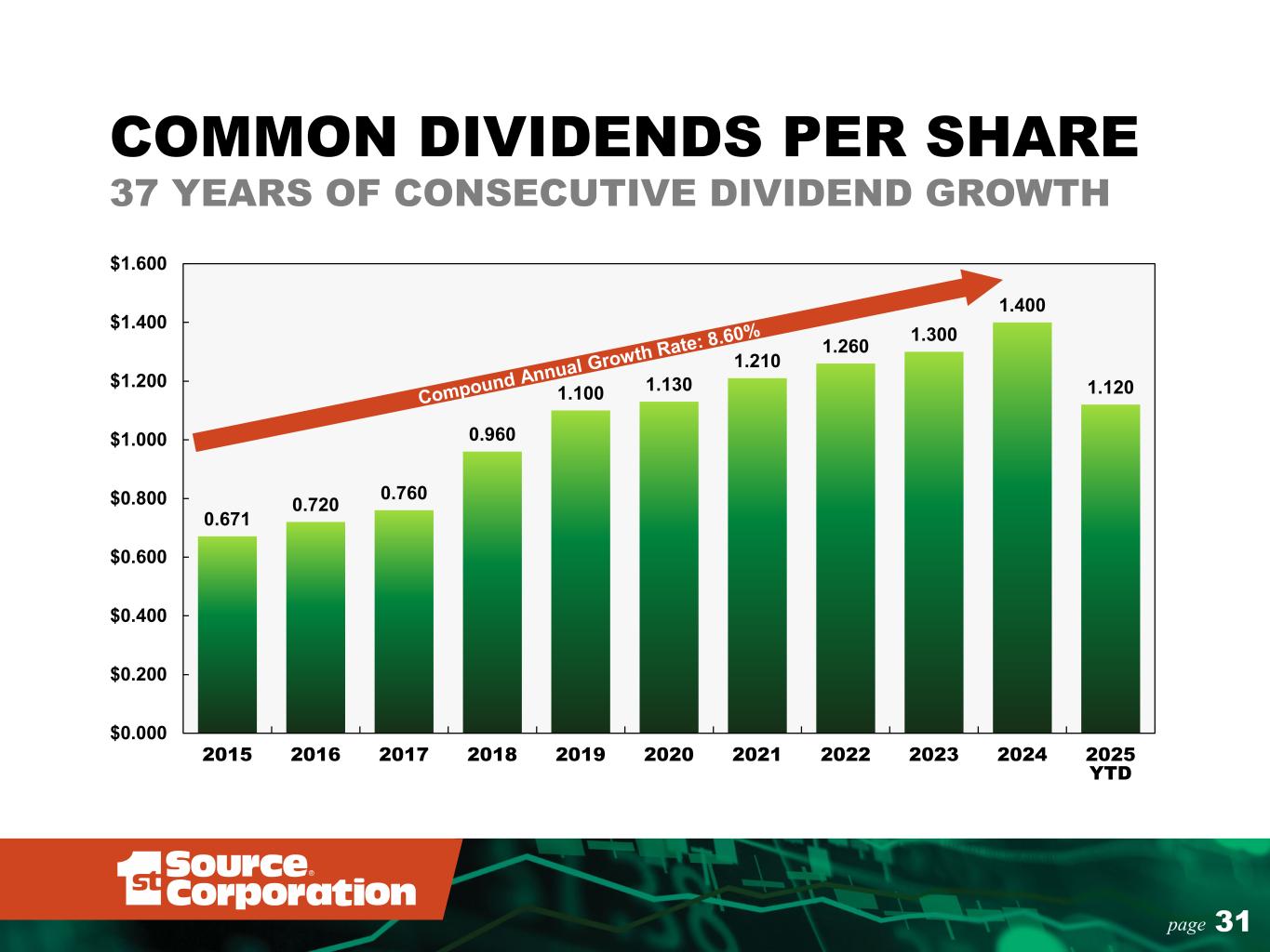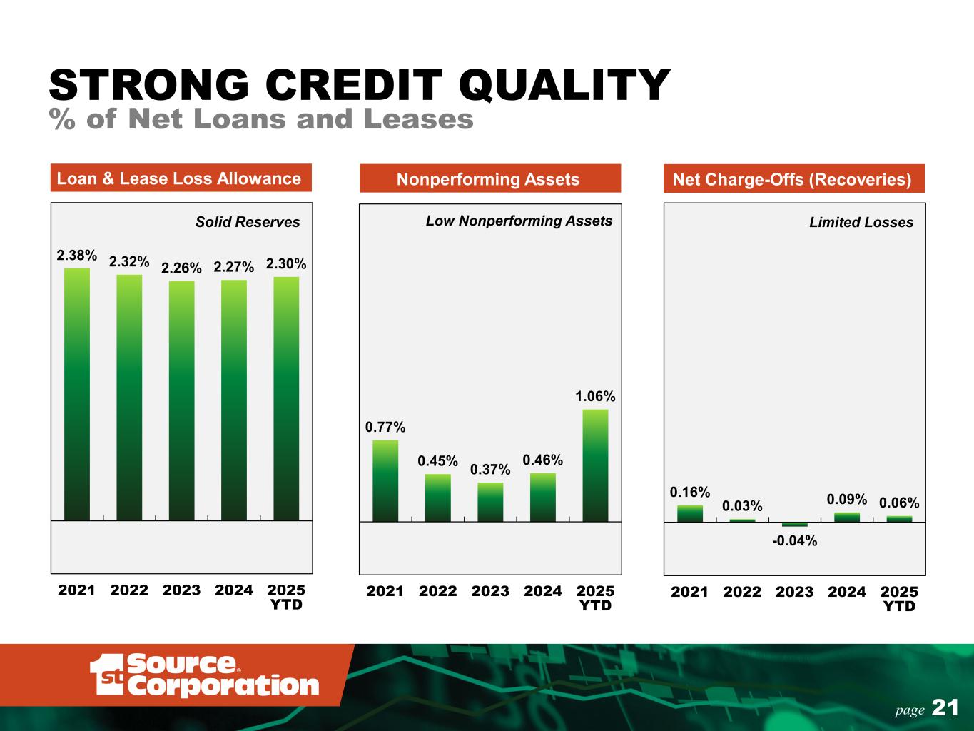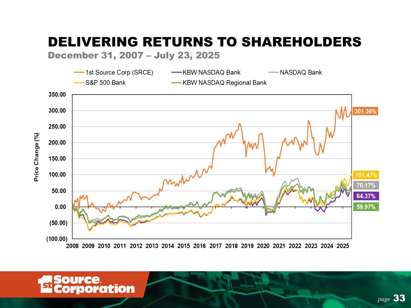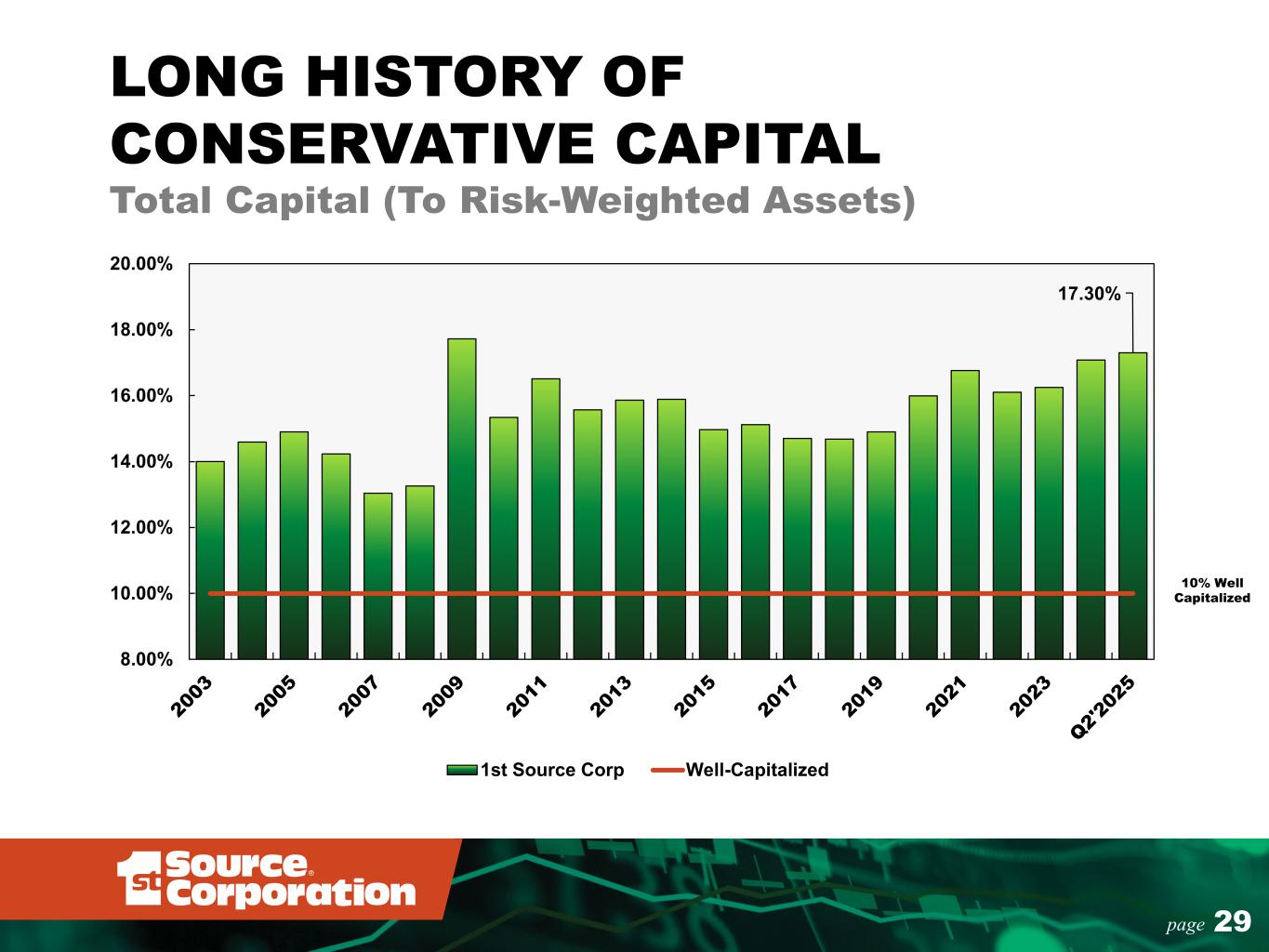 24page 1.41% 1.14% 1.53% 1.49% 1.48% 1.52% 1.69% 11.50% 9.41% 13.07% 13.81% 13.48% 12.54% 12.96% 12.85% 10.42% 14.40% 15.28% 14.82% 13.62% 13.96% 6.00% 10.00% 14.00% 18.00% 0.80% 1.40% 2.00% 2.60% 3.20% 2019 2020 2021 2022 2023 2024 2025 YTD R O AE a nd R O AT E R O AA Return on Average Assets Return on Average Common Equity Return on Average Tangible Common Equity** INCOME PERFORMANCE METRICS 1st SOURCE PERFORMS WELL AGAINST PEERS WHILE MAINTAINING STRONG CAPITAL LEVELS *Peer group data as of March 31, 2025. ** See “Reconciliation of non-GAAP Financial Measures” in Appendix. YTD Median Peer Data* National C&I Midwest ROATE 13.96% 13.62% ROAE 10.89% 10.97% ROAA 1.16% 1.22%