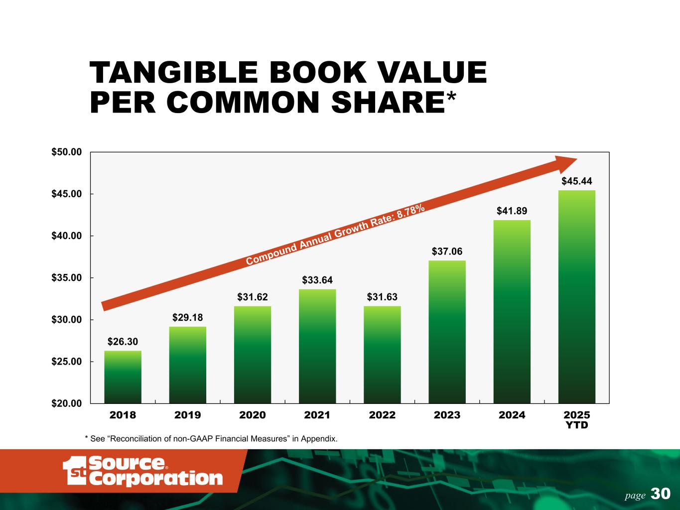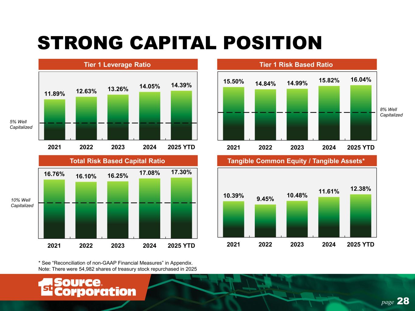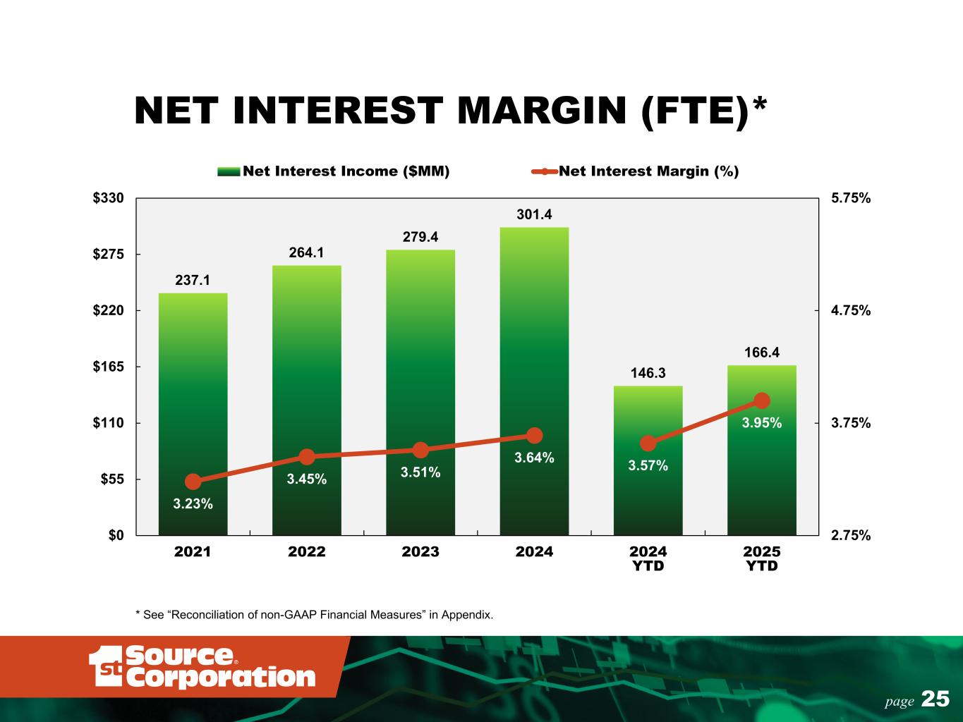 24page 1.41% 1.14% 1.53% 1.49% 1.48% 1.52% 1.69% 11.50% 9.41% 13.07% 13.81% 13.48% 12.54% 12.96% 12.85% 10.42% 14.40% 15.28% 14.82% 13.62% 13.96% 6.00% 10.00% 14.00% 18.00% 0.80% 1.40% 2.00% 2.60% 3.20% 2019 2020 2021 2022 2023 2024 2025 YTD R O AE a nd R O AT E R O AA Return on Average Assets Return on Average Common Equity Return on Average Tangible Common Equity** INCOME PERFORMANCE METRICS 1st SOURCE PERFORMS WELL AGAINST PEERS WHILE MAINTAINING STRONG CAPITAL LEVELS *Peer group data as of March 31, 2025. ** See “Reconciliation of non-GAAP Financial Measures” in Appendix. YTD Median Peer Data* National C&I Midwest ROATE 13.96% 13.62% ROAE 10.89% 10.97% ROAA 1.16% 1.22%
