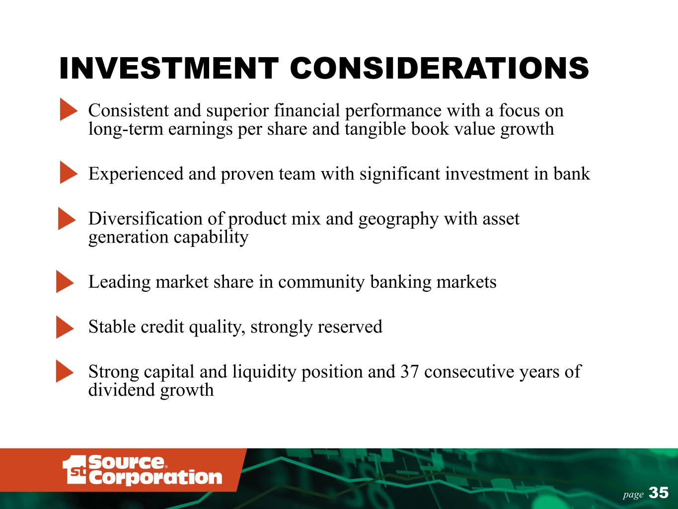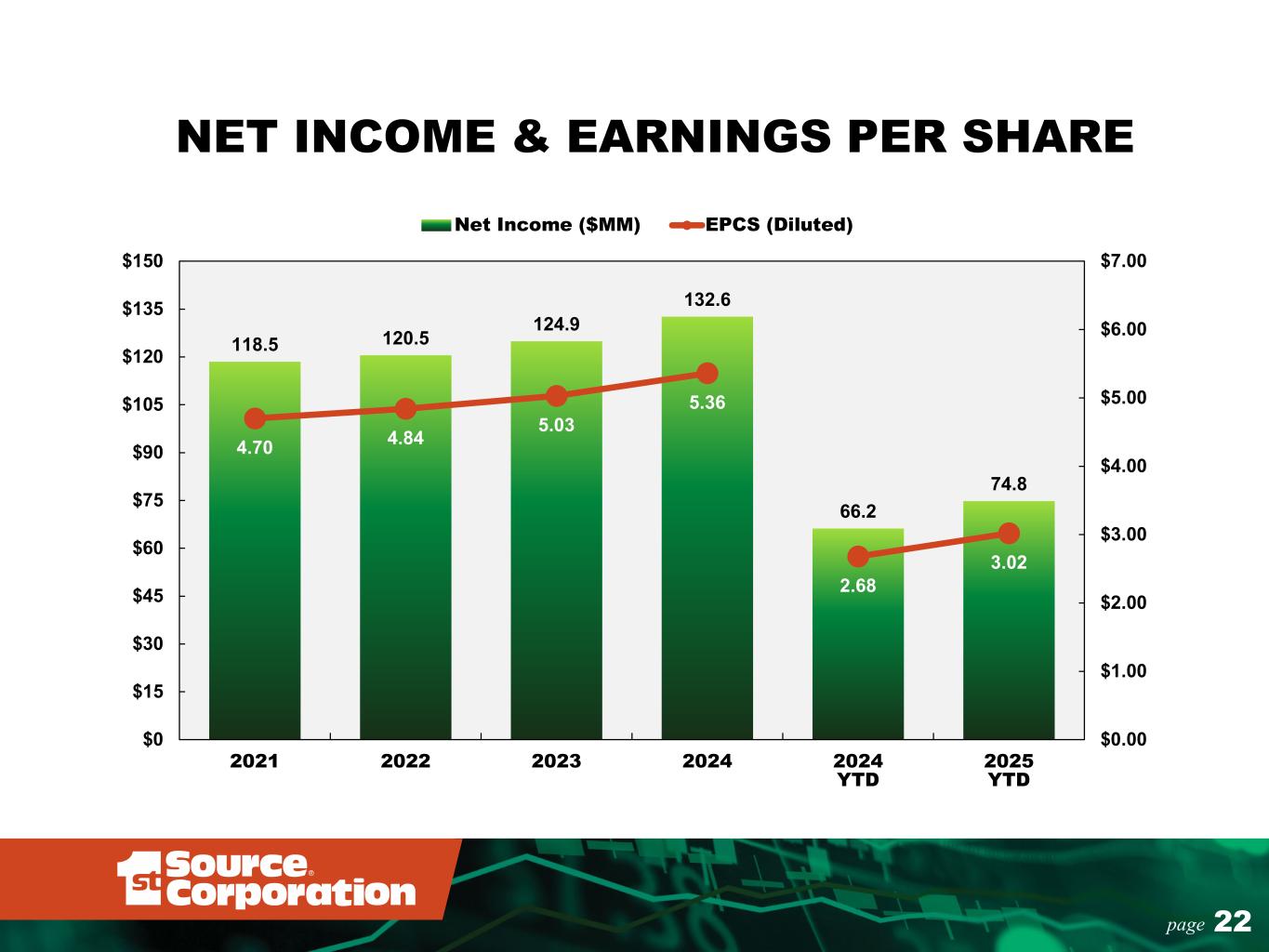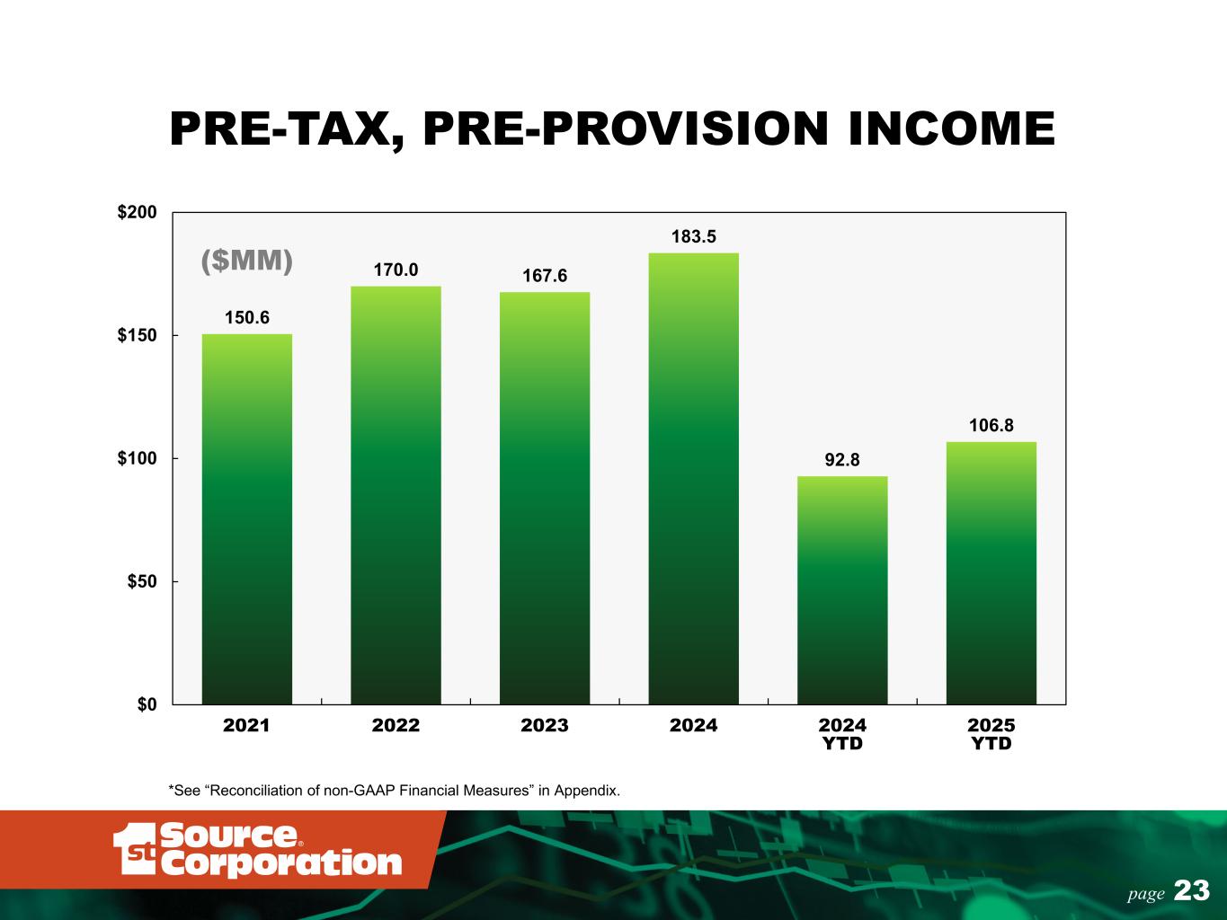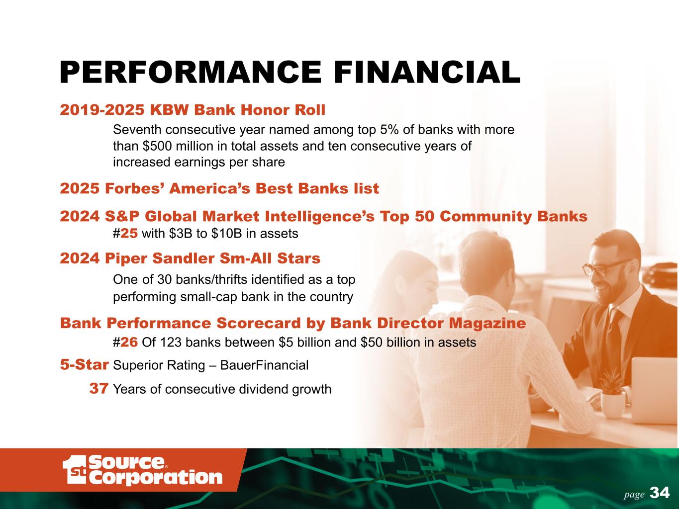 24page 1.41% 1.14% 1.53% 1.49% 1.48% 1.52% 1.69% 11.50% 9.41% 13.07% 13.81% 13.48% 12.54% 12.96% 12.85% 10.42% 14.40% 15.28% 14.82% 13.62% 13.96% 6.00% 10.00% 14.00% 18.00% 0.80% 1.40% 2.00% 2.60% 3.20% 2019 2020 2021 2022 2023 2024 2025 YTD R O AE a nd R O AT E R O AA Return on Average Assets Return on Average Common Equity Return on Average Tangible Common Equity** INCOME PERFORMANCE METRICS 1st SOURCE PERFORMS WELL AGAINST PEERS WHILE MAINTAINING STRONG CAPITAL LEVELS *Peer group data as of March 31, 2025. ** See “Reconciliation of non-GAAP Financial Measures” in Appendix. YTD Median Peer Data* National C&I Midwest ROATE 13.96% 13.62% ROAE 10.89% 10.97% ROAA 1.16% 1.22%