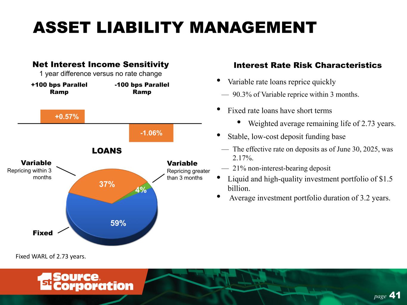 59% 37% 4% 41page Interest Rate Risk Characteristics • Variable rate loans reprice quickly — 90.3% of Variable reprice within 3 months. • Fixed rate loans have short terms • Weighted average remaining life of 2.73 years. • Stable, low-cost deposit funding base — The effective rate on deposits as of June 30, 2025, was 2.17%. — 21% non-interest-bearing deposit • Liquid and high-quality investment portfolio of $1.5 billion. • Average investment portfolio duration of 3.2 years. Net Interest Income Sensitivity 1 year difference versus no rate change +100 bps Parallel Ramp -100 bps Parallel Ramp +0.57% -1.06% LOANS Fixed Variable Repricing within 3 months Variable Repricing greater than 3 months ASSET LIABILITY MANAGEMENT Fixed WARL of 2.73 years.